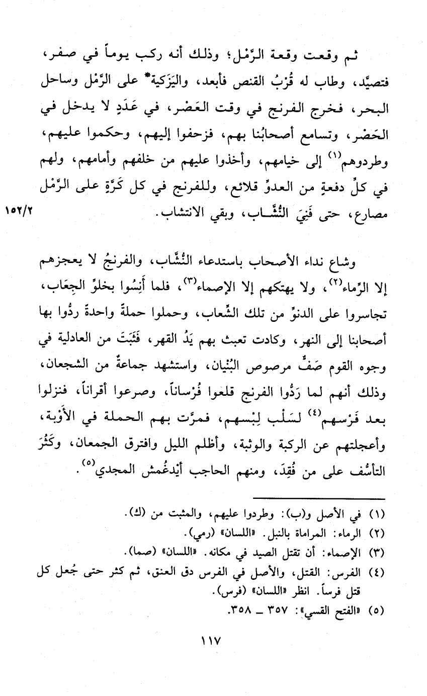 ثمَّ وَقعت وقْعَة الرمل وَذَلِكَ أَنه ركب يَوْمًا فِي صفر فتصيد وطاب لَهُ قرب القنص فأبعد واليزكية على الرمل وساحل الْبَحْر فَخرج الفرنج فِي وَقت الْعَصْر فِي عدد لَا يدْخل فِي الْحصْر وتسامع أَصْحَابنَا بهم فزحفوا إِلَيْهِم وحكموا عَلَيْهِم وطردوهم إِلَى خيامهم وَأخذُوا عَلَيْهِم من خَلفهم وأمامهم وَلَهُم فِي كل دفْعَة من الْعَدو قلائع وللفرنج فِي كل كرة على الرمل مصَارِع حَتَّى فني النشاب وَبَقِي الانتشاب