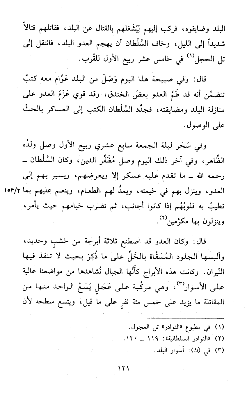 قَالَ وَفِي صَبِيحَة هَذَا الْيَوْم وصل من الْبَلَد عوام مَعَه كتب تَتَضَمَّن أَنه قد طم الْعَدو بعض الخَنْدَق وَقد قوي عزم الْعَدو على منازلة الْبَلَد ومضايقته فجدد السُّلْطَان الْكتب إِلَى العساكر بالحث على الْوُصُول