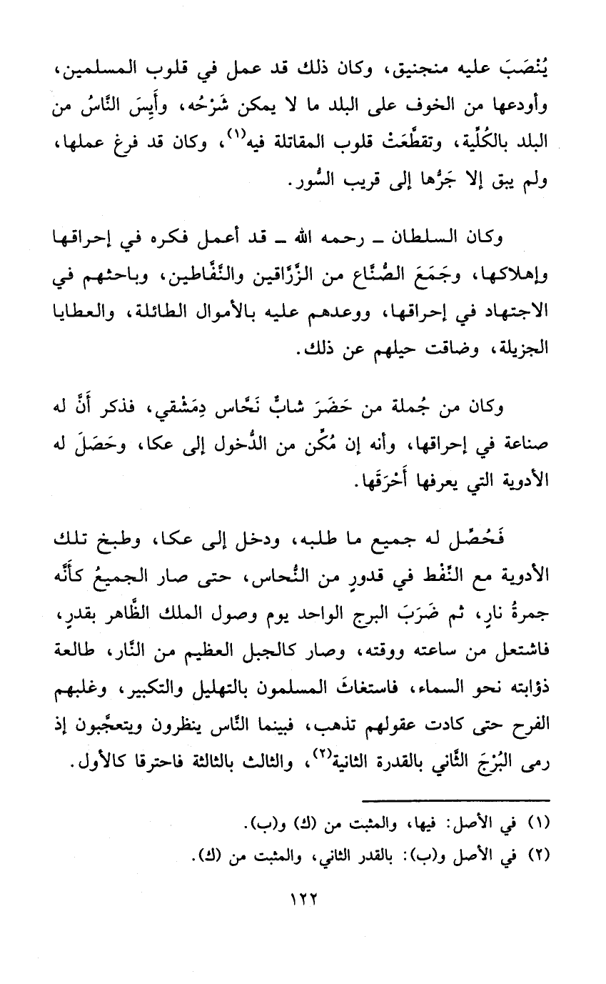 فَحصل لَهُ جَمِيع مَا طلبه وَدخل إِلَى عكا وطبخ تِلْكَ الْأَدْوِيَة مَعَ النفط فِي قدور من النّحاس حَتَّى صَار الْجَمِيع كَأَنَّهُ جَمْرَة نَار ثمَّ ضرب البرج الْوَاحِد يَوْم وُصُول الْملك الظَّاهِر بقدرفاشتعل من سَاعَته وَوَقته وَصَارَ كالجبل الْعَظِيم من النَّار طالعة ذؤابته نَحْو السَّمَاء فاستغاث الْمُسلمُونَ بالتهليل وَالتَّكْبِير وغلبهم الْفَرح حَتَّى كَادَت عُقُولهمْ تذْهب فَبَيْنَمَا النَّاس ينظرُونَ ويتعجبون إِذْ رمى البرج الثَّانِي بِالْقُدْرَةِ الثَّانِيَة وَالثَّالِث بالثالثة فاحترقا كَالْأولِ
