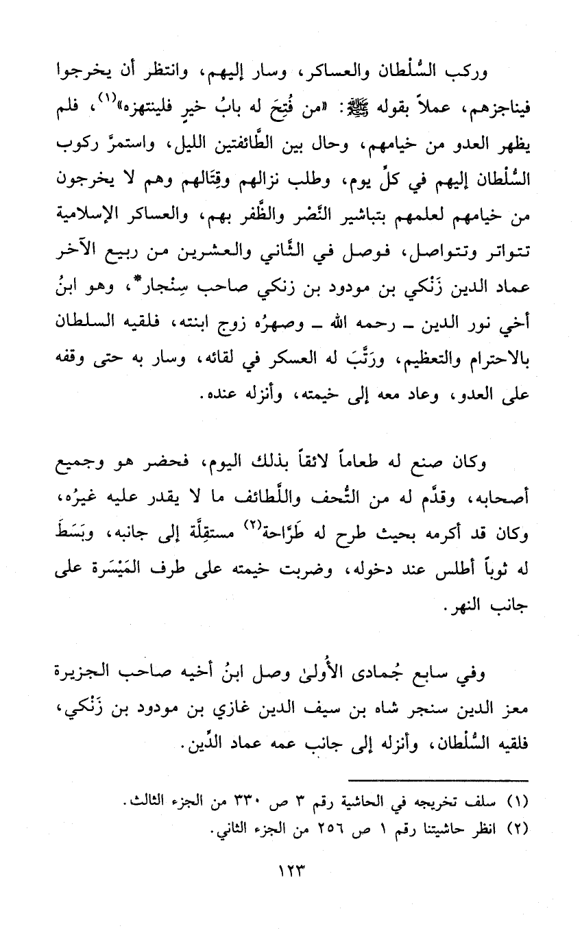 وَركب السُّلْطَان والعساكر وَسَار إِلَيْهِم وانتظرأن يخرجُوا فيناجزهم عملا بقوله صلى الله عَلَيْهِ وَسلم من فتح لَهُ بَاب خير فلينتهزه فَلم يظْهر الْعَدو من خيامهم وَحَال بَين الطَّائِفَتَيْنِ اللَّيْل وَاسْتمرّ ركُوب السُّلْطَان إِلَيْهِم فِي كل يَوْم وَطلب نزالهم وقتالهم وهم لَا يخرجُون من خيامهم لعلمهم بتباشير النَّصْر وَالظفر بهم والعساكر الإسلامية تتواتر وتتواصل فوصل فِي الثَّانِي وَالْعِشْرين من ربيع الآخر عماد الدّين زنكي بن مودود بن زنكي صَاحب سنجار وَهُوَ ابْن أخي نور الدّين - رَحمَه الله - وصهره زوج ابْنَته فَلَقِيَهُ السُّلْطَان بالاحترام والتعظيم ورتب لَهُ الْعَسْكَر فِي لِقَائِه وَسَار بِهِ حَتَّى وَقفه على الْعَدو وَعَاد مَعَه إِلَى خيمته وأنزله عِنْده