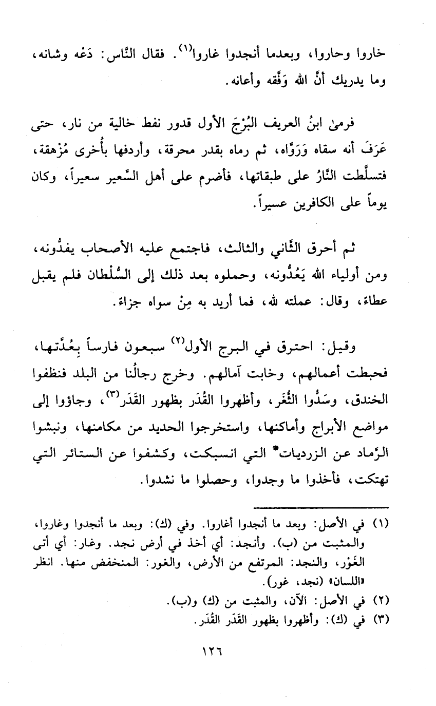 ثمَّ أحرق الثَّانِي وَالثَّالِث فَاجْتمع عَلَيْهِ الْأَصْحَاب يفدونه وَمن أَوْلِيَاء الله يعدونه وَحَمَلُوهُ بعد ذَلِك إِلَى السُّلْطَان فَلم يقبل عَطاء وَقَالَ عملته لله فَمَا أُرِيد بِهِ سواهُ جَزَاء وَقيل احْتَرَقَ فِي البرج الأول سَبْعُونَ فَارِسًا بعدتها فحبطت أَعْمَالهم وخابت آمالهم وَخرج رجالنا من الْبَلَد فنظفوا الخَنْدَق وسدوا الثغر وأظهروا الْقدر بِظُهُور الْقدر وجاؤوا إِلَى مَوَاضِع الأبراج وأماكنها وَاسْتَخْرَجُوا الْحَدِيد من مكامنها ونبشوا الرماد عَن الزرديات الَّتِي انسبكت وكشفوا عَن الستائر الَّتِي تهتكت فَأخذُوا مَا وجدوا وحصلوا مَا نشدوا