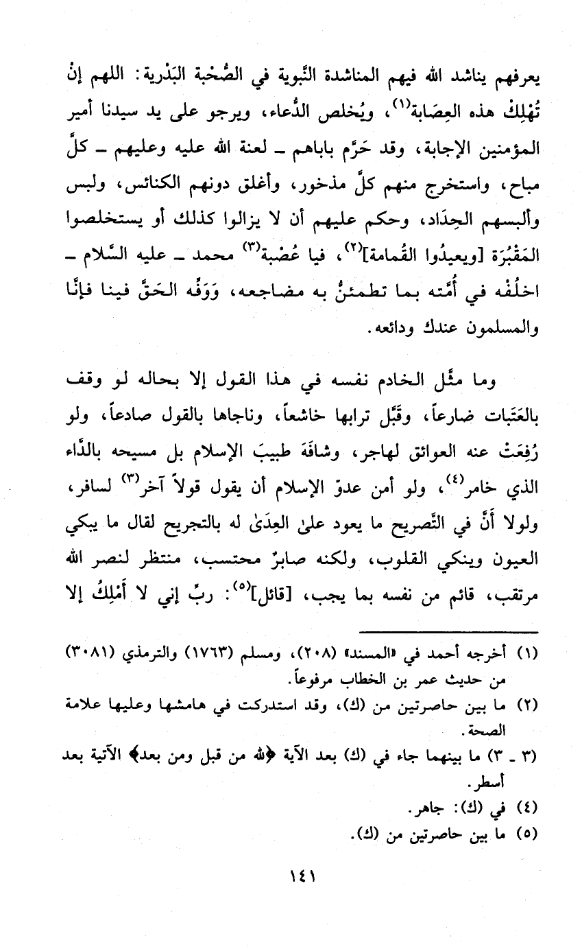 وَمَا مثل الْخَادِم نَفسه فِي هَذَا القَوْل إِلَّا بِحَالهِ لَو وقف بالعتبات ضارعا وَقبل ترابها خَاشِعًا وناجاها بالْقَوْل صادعا وَلَو رفعت عَنهُ الْعَوَائِق لهاجر وشافه طَبِيب الْإِسْلَام بل مسيحه بالداء الَّذِي خامر وَلَو أَمن عَدو الْإِسْلَام أَن يَقُول قولا آخر لسافر وَلَوْلَا أَن فِي التَّصْرِيح مَا يعود على العدى لَهُ بالتجريح لقَالَ مَا يبكي الْعُيُون وينكي الْقُلُوب وَلكنه صابر محتسب منتظر لنصر الله مرتقب قَائِم من نَفسه بِمَا يجب قَائِل رب إِنِّي لَا املك إِلَّا
