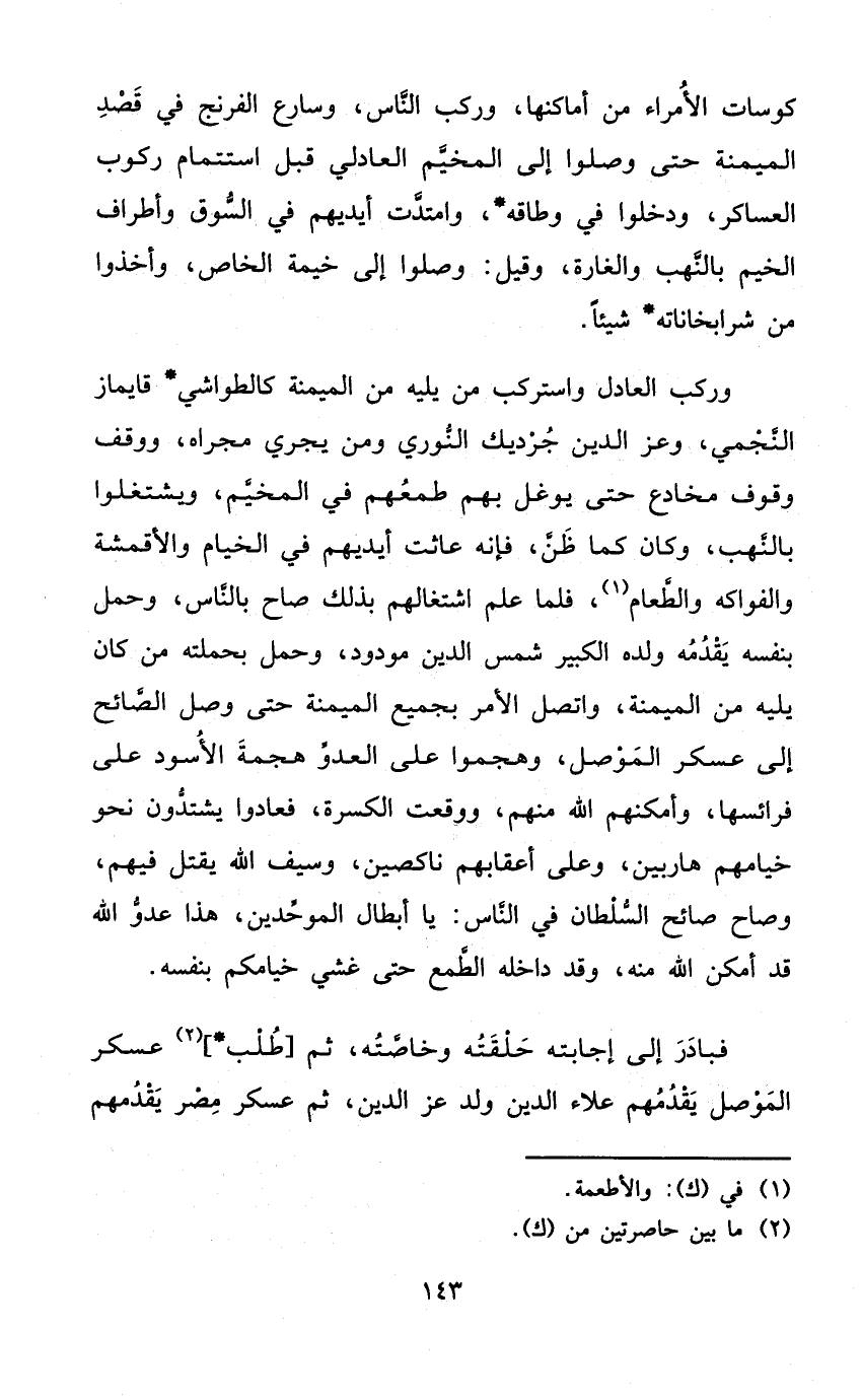 وَركب الْعَادِل واستركب من يَلِيهِ من الميمنة كالطواشي قايماز النجمي وَعز الدّين جرديك النوري وَمن يجْرِي مجْرَاه ووقف وقُوف مخادع حَتَّى يوغل بهم طمعهم فِي المخيم ويشتغلوا بالنهب وَكَانَ كَمَا ظن فَإِنَّهُ عاثت أَيْديهم فِي الْخيام والأقمشة والفواكه وَالطَّعَام فَلَمَّا علم اشتغالهم بذلك صَاح بِالنَّاسِ وَحمل بِنَفسِهِ يقدمهُ وَلَده الْكَبِير شمس الدّين مودود وَحمل بحملته من كَانَ يَلِيهِ من الميمنة واتصل الْأَمر بِجَمِيعِ الميمنة حَتَّى وصل الصائح إِلَى عَسْكَر الْموصل وهجموا على الْعَدو هجمة الْأسود على فرائسها وأمكنهم الله مِنْهُم وَوَقعت الكسرة فعادوا يَشْتَدُّونَ نَحْو خيامهم هاربين وعَلى أَعْقَابهم ناكصين وَسيف الله يقتل فيهم وَصَاح صائح السُّلْطَان فِي النَّاس يَا أبطال الْمُوَحِّدين هَذَا عَدو الله قد أمكن الله مِنْهُ وَقد دَاخله الطمع حَتَّى غشي خيامكم بِنَفسِهِ