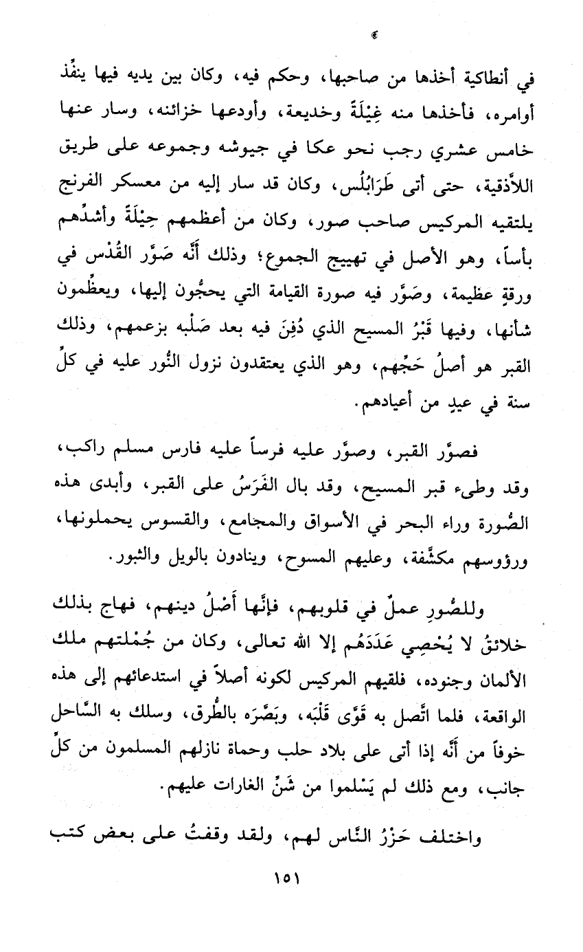 فِي أنطاكية أَخذهَا من صَاحبهَا وَحكم فِيهِ وَكَانَ بَين يَدَيْهِ فِيهَا ينفذ أوامره فَأَخذهَا مِنْهُ غيلَة وخديعة وأودعها خزائنه وَسَار عَنْهَا خَامِس عشري رَجَب نَحْو عكا فِي جيوشه وجموعه على طَرِيق اللاذقية حَتَّى أَتَى طرابلس وَكَانَ قد سَار إِلَيْهِ من معسكر الفرنج يلتقيه المركيس صَاحب صور وَكَانَ من أعظمهم حِيلَة وأشدهم بَأْسا وَهُوَ الأَصْل فِي تهييج الجموع وَذَلِكَ أَنه صور الْقُدس فِي ورقة عَظِيمَة وصور فِيهِ صُورَة الْقِيَامَة الَّتِي يحجون إِلَيْهَا ويعظمون شَأْنهَا وفيهَا قبر الْمَسِيح الَّذِي دفن فِيهِ بعد صلبه بزعمهم وَذَلِكَ الْقَبْر هُوَ أصل حجهم وَهُوَ الَّذِي يَعْتَقِدُونَ نزُول النُّور عَلَيْهِ فِي كل سنة فِي عيد من أعيادهم