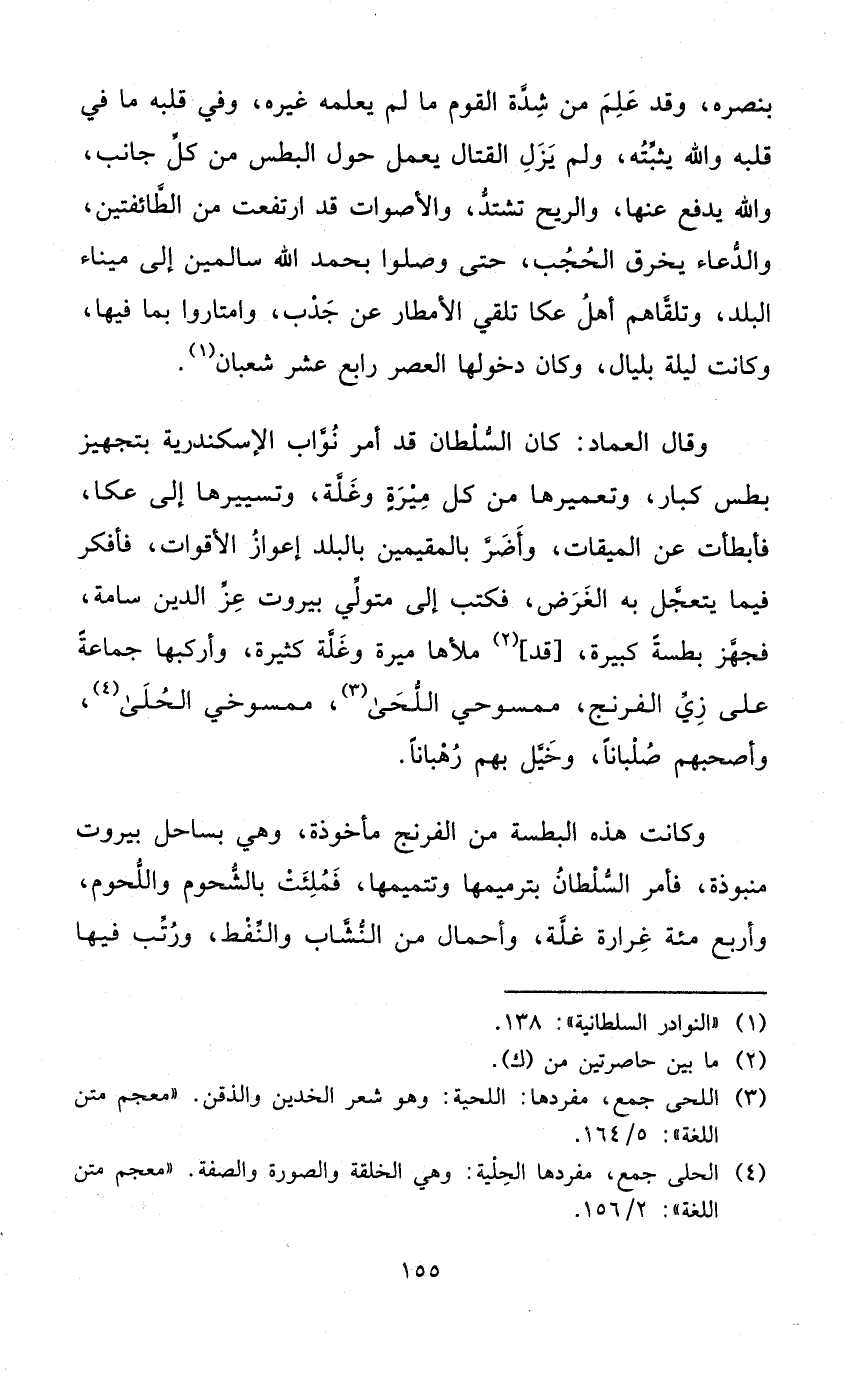 وَقَالَ الْعِمَاد كَانَ السُّلْطَان قد أَمر نواب الاسكندرية بتجهيز بطس كبار وتعميرها من كل ميرة وغلة وتسييرها إِلَى عكا فأبطأت عَن الْمِيقَات وأضر بالمقيمين بِالْبَلَدِ إعواز الأقوات فأفكر فِيمَا يتعجل بِهِ الْغَرَض فَكتب إِلَى مُتَوَلِّي بيروت عز الدّين سامة فَجهز بطسة كَبِيرَة قد ملأها ميرة وغلة كَثِيرَة وأركبها جمَاعَة على زِيّ الفرنج ممسوحي اللحى ممسوخي الحلى وأصحبهم صلبانا وخيل بهم رهبانا