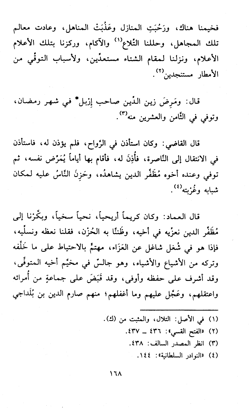 قَالَ الْعِمَاد وَكَانَ كَرِيمًا أريحيا نحيا سخيا وبكرنا إِلَى مظفر الدّين نعزيه فِي أَخِيه وظننا بِهِ الْحزن فَقُلْنَا نعظه ونسليه فَإِذا هُوَ فِي شغل شاغل عَن العزاء مهتم بِالِاحْتِيَاطِ على مَا خَلفه وَتَركه من الأشياع والأشياء وهوجالس فِي مخيم أَخِيه الْمُتَوفَّى وَقد أشرف على حفظه وأوفى وَقد قبض على جمَاعَة من أمرائه واعتقلهم وَعجل عَلَيْهِم وَمَا أغفلهم مِنْهُم صارم الدّين بن بلداجي