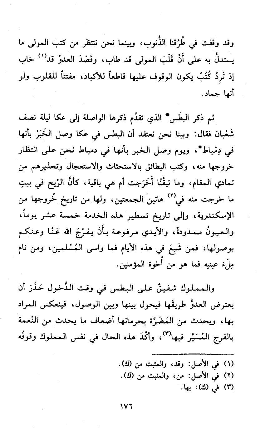 ثمَّ ذكر البطس الَّذِي تقدم ذكرهَا الْوَاصِلَة إِلَى عكا لَيْلَة نصف شعْبَان فَقَالَ وَبينا نَحن نعتقد أَن البطس فِي عكا وصل الْخَبَر بِأَنَّهَا فِي دمياط وَيَوْم وصل الْخَبَر بِأَنَّهَا فِي دمياط نَحن على انْتِظَار خُرُوجهَا مِنْهُ وَكتب البطائق بالاستحثاث والاستعجال وتحذيرهم من تمادي الْمقَام وَمَا تَيَقنا أخرجت أم هِيَ بَاقِيَة كَأَن الرّيح فِي بَيت مَا خرجت مِنْهُ فِي هَاتين الجمعتين وَلها من تَارِيخ خُرُوجهَا من الاسكندرية وَإِلَى تَارِيخ تسطير هَذِه الْخدمَة خَمْسَة عشر يَوْمًا والعيون ممدودة وَالْأَيْدِي مَرْفُوعَة بِأَن يفرج الله عَنَّا وعنكم بوصولها فَمن شبع فِي هَذِه الْأَيَّام فَمَا واسى الْمُسلمين وَمن نَام ملْء عَيْنَيْهِ فَمَا هُوَ من أخوة الْمُؤمنِينَ