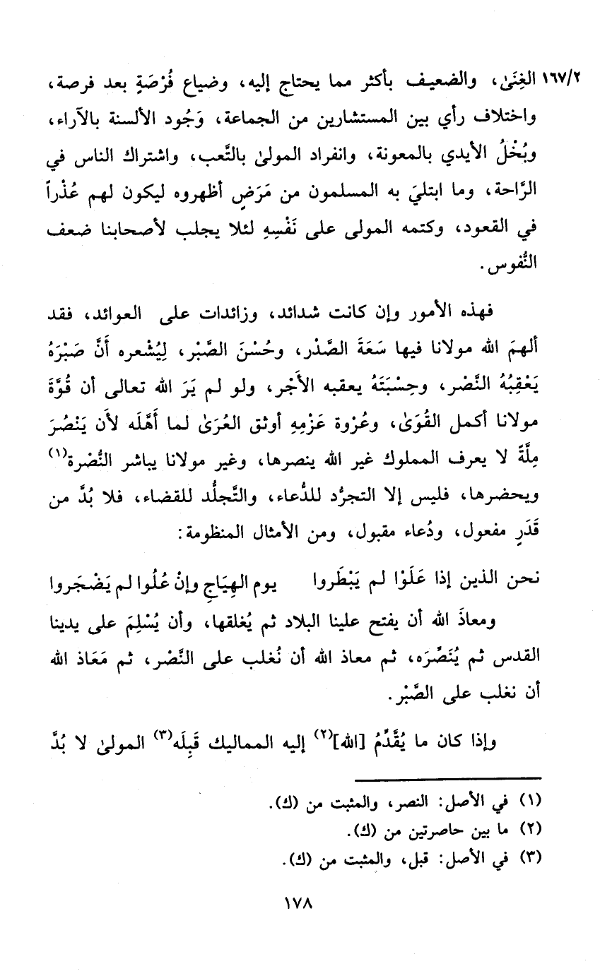 فَهَذِهِ الْأُمُور وَإِن كَانَت شَدَائِد وزائدات على العوائد فقد ألهم الله مَوْلَانَا فِيهَا سَعَة الصَّدْر وَحسن الصَّبْر ليشعره أَن صبره يعقبه النَّصْر وحسبته يعقبه الْأجر وَلَو لم ير الله تَعَالَى أَن قُوَّة مَوْلَانَا أكمل القوى وَعُرْوَة عزمه أوثق العرى لما أَهله لِأَن ينصر مِلَّة لَا يعرف الْمَمْلُوك غير الله ينصرها وَغير مَوْلَانَا يُبَاشر النُّصْرَة ويحضرها فَلَيْسَ إِلَّا التجرد للدُّعَاء والتجلد للْقَضَاء فَلَا بُد من قدر مفعول وَدُعَاء مَقْبُول وَمن الْأَمْثَال الْمَنْظُومَة