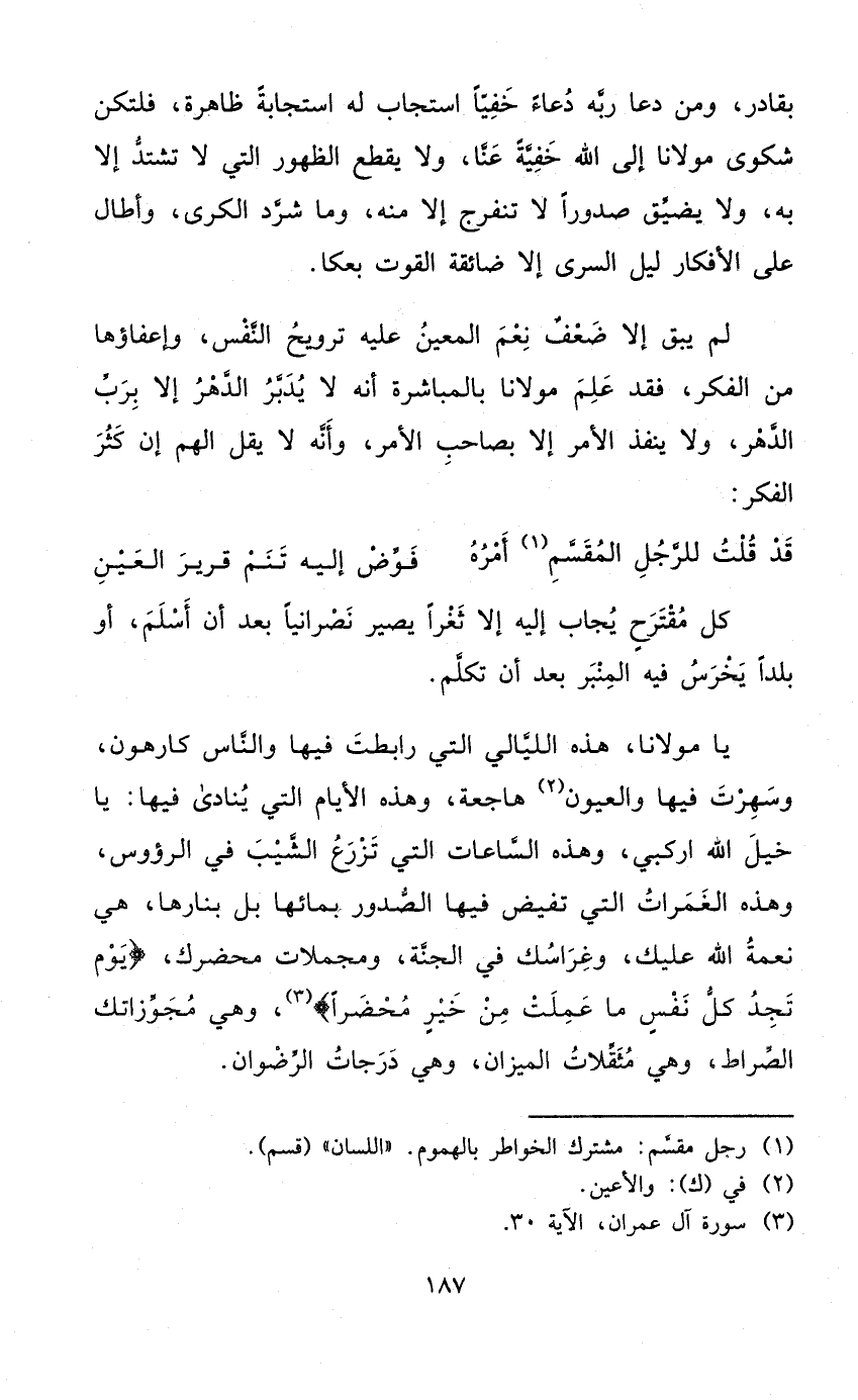 يَا مَوْلَانَا هَذِه اللَّيَالِي الَّتِي رابطت فِيهَا وَالنَّاس كَارِهُون وسهرت فِيهَا والعيون هاجعة وَهَذِه الْأَيَّام الَّتِي يُنَادى فِيهَا يَا خيل الله ارْكَبِي وَهَذِه السَّاعَات الَّتِي تزرع الشيب فِي الرؤوس وَهَذِه الغمرات الَّتِي تفيض فِيهَا الصُّدُور بِمَائِهَا بل بنارها هِيَ نعْمَة الله عَلَيْك وغراسك فِي الْجنَّة ومجملات محضرك {يَوْم تَجِد كل نفس مَا عملت من خير محضرا} وَهِي مجوزاتك الصِّرَاط وَهِي مثقلات الْمِيزَان وَهِي دَرَجَات الرضْوَان