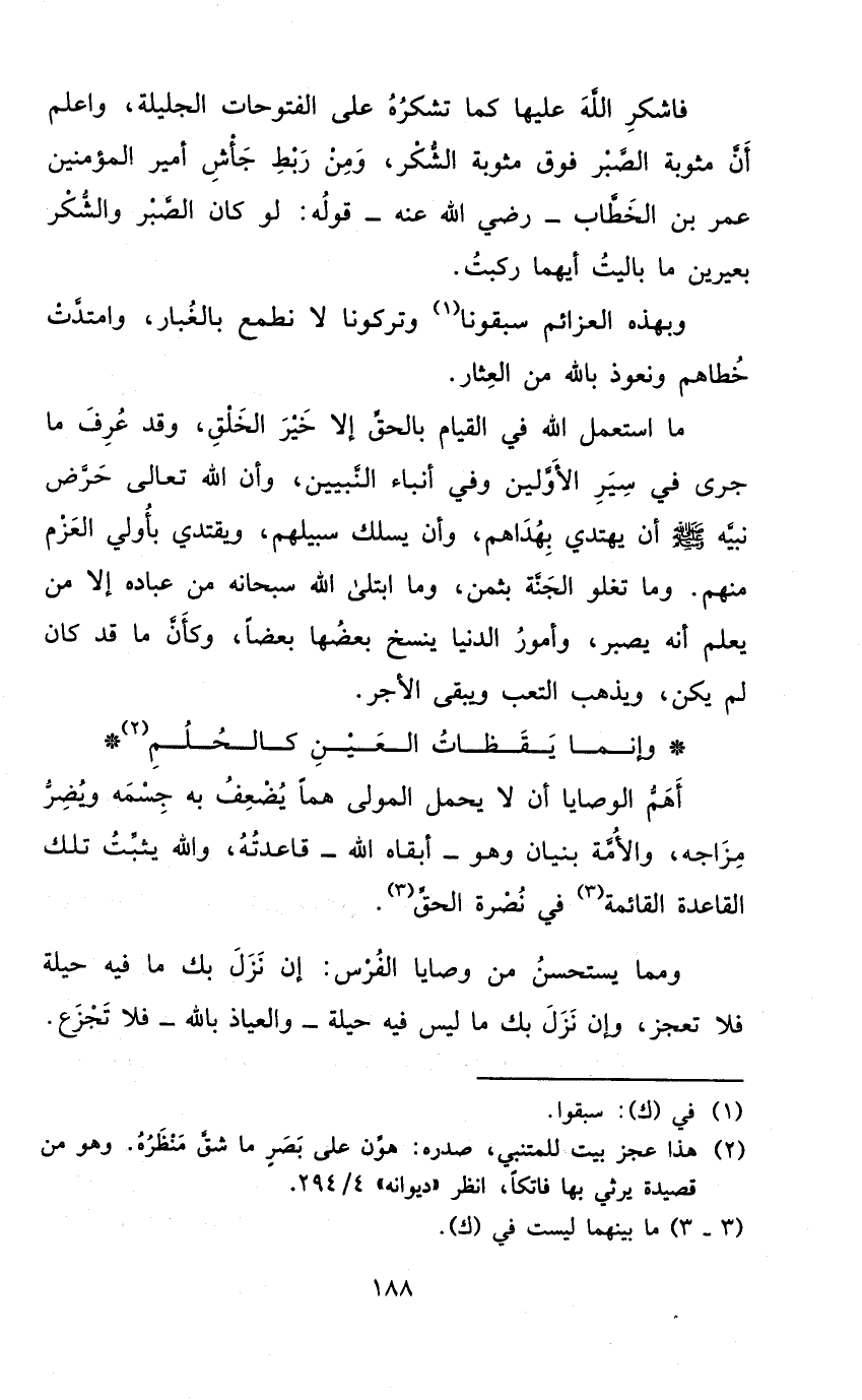 فاشكر الله عَلَيْهَا كَمَا تشكره على الفتوحات الجليلة وَاعْلَم أَن مثوبة الصَّبْر فَوق مثوبة الشُّكْر وَمن ربط جأش أَمِير الْمُؤمنِينَ عمر بن الْخطاب رَضِي الله عَنهُ قَوْله لَو كَانَ الصَّبْر وَالشُّكْر بَعِيرَيْنِ مَا باليت أَيهمَا ركبت