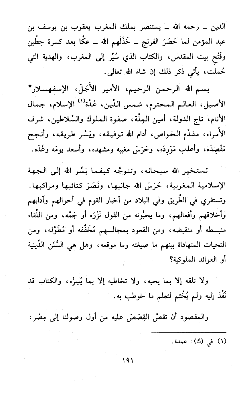 تستخير الله سُبْحَانَهُ وتتوجه كَيْفَمَا يسر الله إِلَى الْجِهَة الإسلامية المغربية حرس الله جَانبهَا وَنصر كتائبها ومراكبها وتستقري فِي الطَّرِيق وَفِي الْبِلَاد من أَخْبَار الْقَوْم فِي أَحْوَالهم وآدابهم وأخلاقهم وأفعالهم وَمَا يحبونه من القَوْل نزره أَو جمه وَمن اللِّقَاء منبسطه أَو منقبضه وَمن الْقعُود بمجالسهم مخففه أَو مطوله وَمن التَّحِيَّات المتهاداة بَينهم مَا صيغته وَمَا موقعه وَهل هِيَ السّنَن الدِّينِيَّة أَو العوائد الملوكية