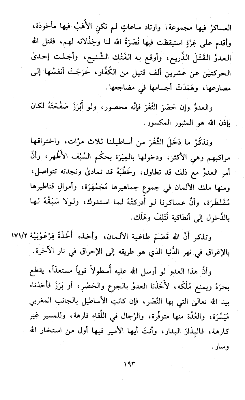 وَأَن هَذَا الْعَدو لَو أرسل الله عَلَيْهِ أسطولا قَوِيا مستعدا يقطع بحره وَيمْنَع ملكه لأخذنا الْعَدو بِالْجُوعِ والحصر أَو برز فأخذناه بيد الله تَعَالَى الَّتِي بهَا النَّصْر فان كَانَت الأساطيل بالجانب المغربي ميسرَة وَالْعدة مِنْهَا متوفرة وَالرِّجَال فِي اللِّقَاء فارهة وللمسير غيركارهة فالبدار البدار وَأَنت أَيهَا الْأَمِير فِيهَا أول من استخار الله وَسَار