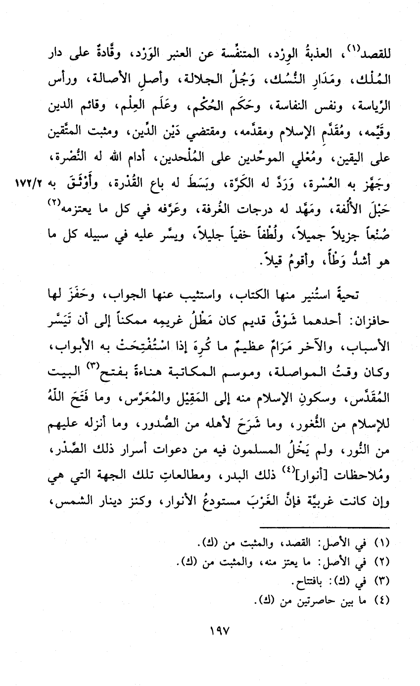 للقصد العذبة الْورْد المتنفسة عَن العنبر الْورْد وقادة على دَار الْملك ومدار النّسك وَجل الْجَلالَة وأصل الْأَصَالَة وَرَأس الرياسة وَنَفس النفاسة وَحكم الحكم وَعلم الْعلم وقائم الدّين وقيمه ومقدم الْإِسْلَام ومقدمه ومقتضي دين الدّين ومثبت الْمُتَّقِينَ على الْيَقِين ومعلي الْمُوَحِّدين على الْمُلْحِدِينَ أدام الله لَهُ النُّصْرَة وجهز بِهِ الْعسرَة ورد لَهُ الكرة وَبسط لَهُ بَاعَ الْقُدْرَة وأوثق بِهِ حَبل الألفة ومهد لَهُ دَرَجَات الغرفة وعرفه فِي كل مَا يعتزمه صنعا جزيلا جميلا ولطفا خفِيا جَلِيلًا وَيسر عَلَيْهِ فِي سَبيله كل مَا هُوَ أَشد وطأ وأقوم قيلا
