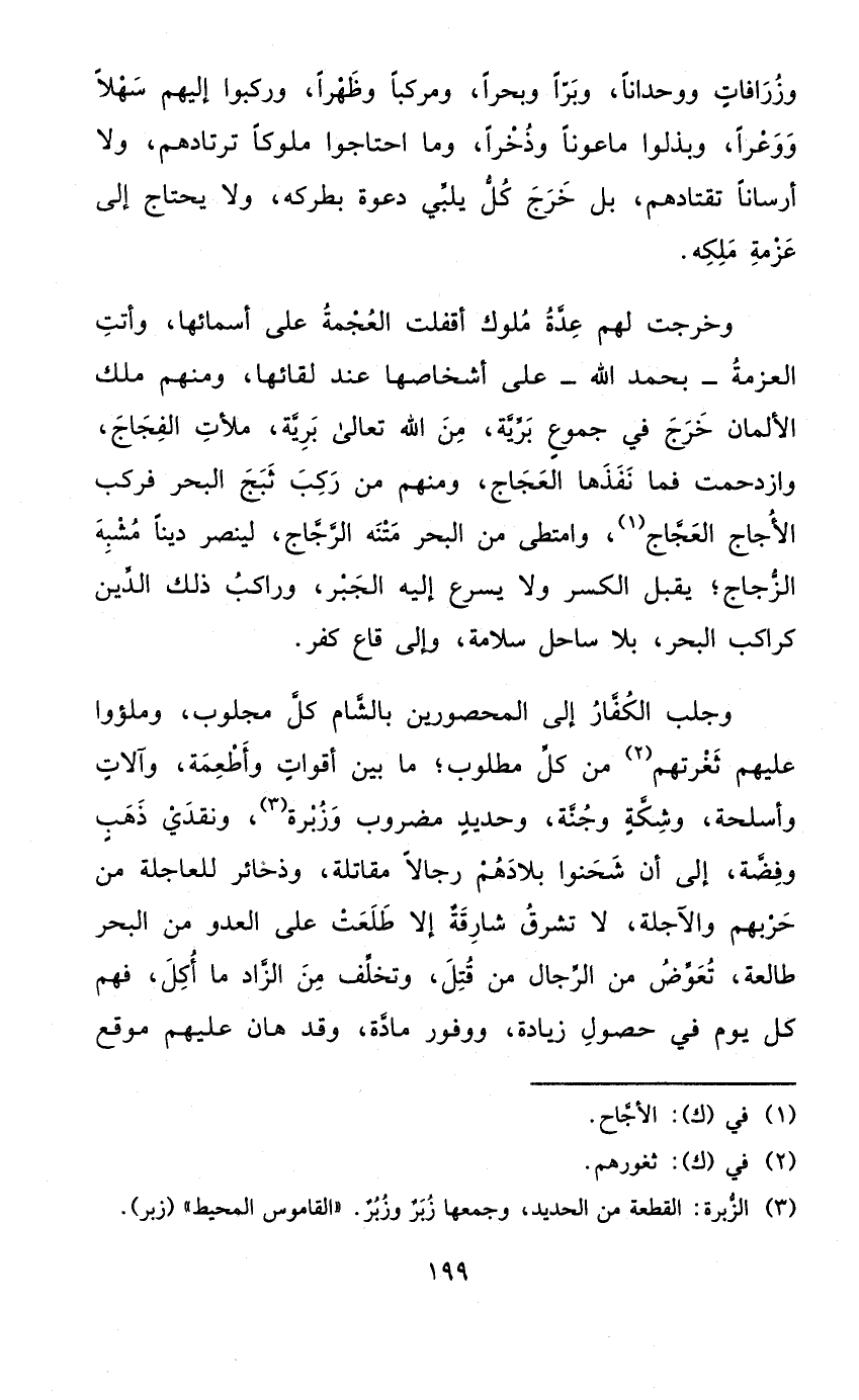 وَخرجت لَهُم عدَّة مُلُوك أقفلت العجمة على أسمائها وَأَتَتْ العزمة بِحَمْد الله على أشخاصها عِنْد لقائها وَمِنْهُم ملك الألمان خرج فِي جموع بَريَّة من الله تَعَالَى بَريَّة مَلَأت الفجاج وازدحمت فَمَا نفذها العجاج وَمِنْهُم من ركب ثبج الْبَحْر فَركب الأجاج العجاج وامتطى من الْبَحْر مَتنه الرجاج لينصر دينا مشبه الزّجاج يقبل الْكسر وَلَا يسْرع إِلَيْهِ الْجَبْر وراكب ذَلِك الدّين كراكب الْبَحْر بِلَا سَاحل سَلامَة وَإِلَى قاع كفر