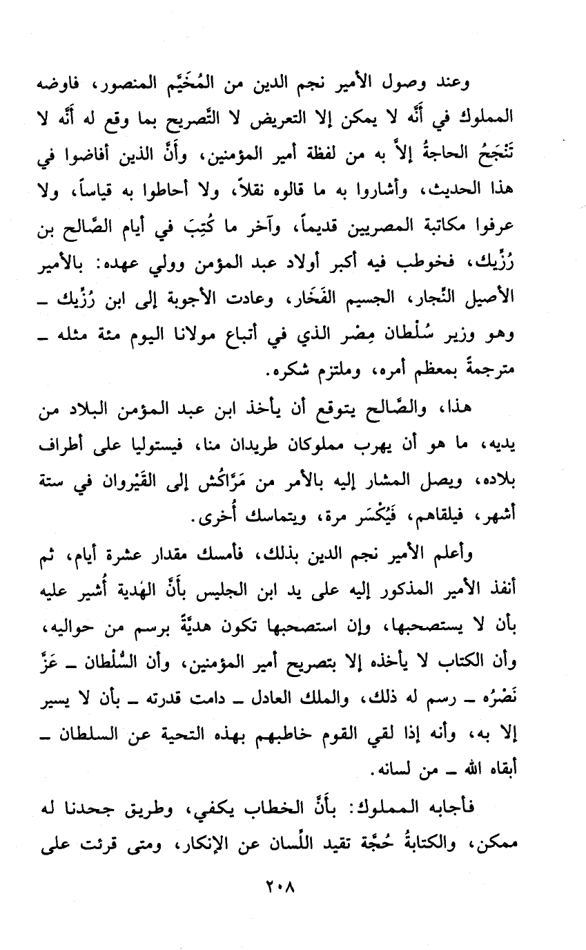 وَعند وُصُول الْأَمِير نجم الدّين من المخيم الْمَنْصُور فاوضه الْمَمْلُوك فِي أَنه لَا يُمكن إِلَّا التَّعْرِيض لَا التَّصْرِيح بِمَا وَقع لَهُ أَنه لَا تنجح الْحَاجة إِلَّا بِهِ من لَفْظَة أَمِير الْمُؤمنِينَ وَأَن الَّذين أفاضوا فِي هَذَا الحَدِيث وأشاروا بِهِ قَالُوهُ نقلا وَلَا أحاطوا بِهِ قِيَاسا وَلَا عرفُوا مُكَاتبَة المصريين قَدِيما وَآخر مَا كتب فِي أَيَّام الصَّالح بن رزيك فخوطب فِيهِ أكبر أَوْلَاد عبد الْمُؤمن وَولي عَهده بالأمير الْأَصِيل النجار الجسيم الفخار وعادت الْأَجْوِبَة إِلَى ابْن رزيك وَهُوَ وَزِير سُلْطَان مصر الَّذِي فِي أَتبَاع مَوْلَانَا الْيَوْم مئة مثله مترجمة بمعظم أمره وملتزم شكره