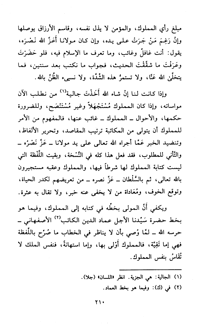 وَيَكْفِي أَن الْمولى بِخَطِّهِ فِي كِتَابه إِلَى الْمَمْلُوك وَفِيمَا هُوَ بِخَط حَضْرَة سيدنَا الْأَجَل عماد الدّين الْكَاتِب الْأَصْفَهَانِي حرسه الله لما وَصِيّ بِأَن لَا يناظر فِي الْخطاب مَا صرح باللفظة فَهِيَ إِمَّا تقية فالمملوك أولى بهَا وَإِمَّا استهانة فَنَفْس الْملك لَا تقاس بِنَفس الْمَمْلُوك