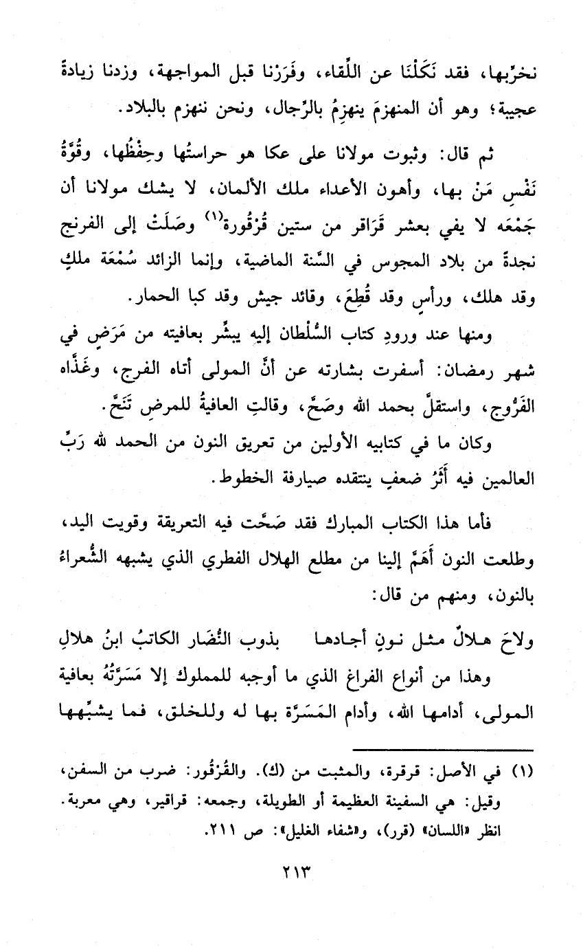 ثمَّ قَالَ وَثُبُوت مَوْلَانَا على عكا هُوَ حراستها وحفظها وَقُوَّة نفس من بهَا وأهون الْأَعْدَاء ملك الألمان لَا يشك مَوْلَانَا أَن جمعه لَا يَفِي بِعشر قراقر من سِتِّينَ قرقورة وصلت إِلَى الفرنج نجدة من بِلَاد الْمَجُوس فِي السّنة الْمَاضِيَة وَإِنَّمَا الزَّائِد سَمعه ملك وَقد هلك وَرَأس وَقد قطع وقائد جَيش وَقد كبا الْحمار