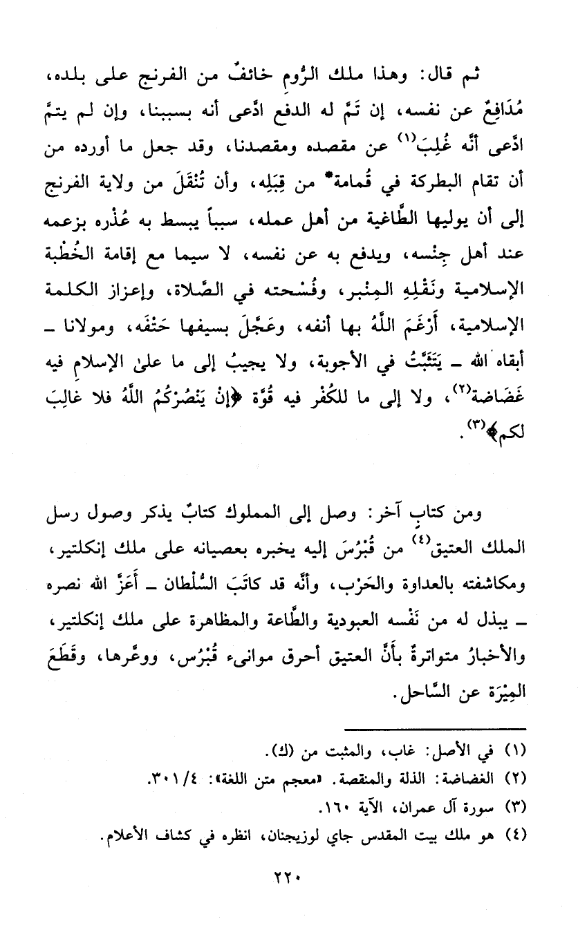ثمَّ قَالَ وَهَذَا ملك الرّوم خَائِف من الفرنج على بَلَده مدافع عَن نَفسه إِن تمّ لَهُ الدّفع ادّعى أَنه بسببنا وَإِن لم يتم ادّعى أَنه غلب عَن مقْصده ومقصدنا وَقد جعل مَا أوردهُ من أَن تُقَام البطركة فِي قمامة من قبله وَأَن تنقل من ولَايَة الفرنج إِلَى أَن يوليها الطاغية من أهل عمله سَببا يبسط بِهِ عذره بِزَعْمِهِ عِنْد أهل جنسه وَيدْفَع بِهِ عَن نَفسه لَا سِيمَا مَعَ إِقَامَة الْخطْبَة الإسلامية وَنَقله الْمِنْبَر وفسحته فِي الصَّلَاة وإعزاز الْكَلِمَة الإسلامية أرْغم الله بهَا أَنفه وَعجل بسيفها حتفه ومولانا أبقاه الله يثبت فِي الْأَجْوِبَة وَلَا يُجيب إِلَى مَا على الْإِسْلَام فِيهِ غَضَاضَة وَلَا إِلَى مَا للكفر فِيهِ قُوَّة {إِن ينصركم الله فَلَا غَالب لكم}