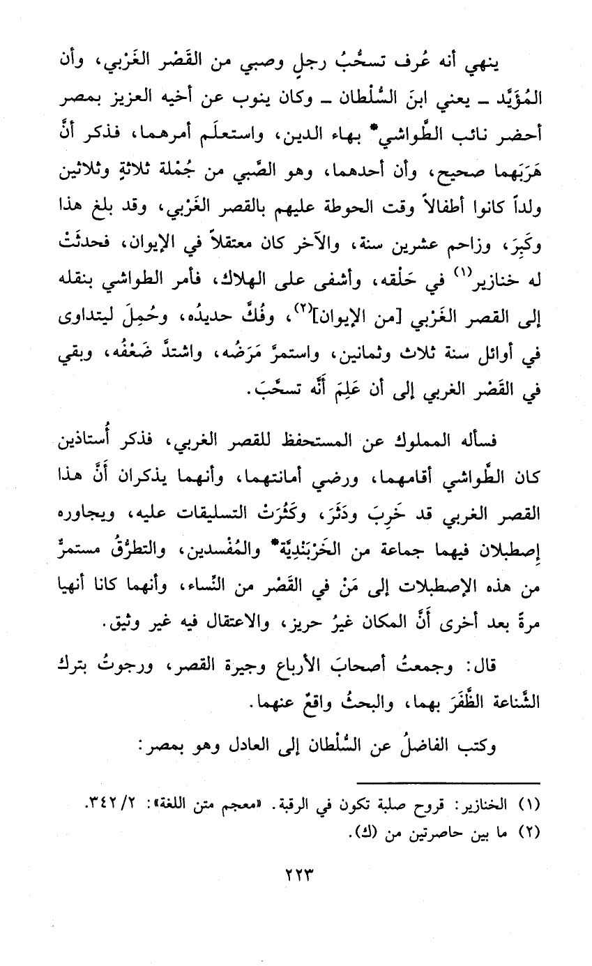 يُنْهِي أَنه عرف تسحب رجل وَصبي من الْقصر الغربي وَأَن الْمُؤَيد يَعْنِي ابْن السُّلْطَان وَكَانَ يَنُوب عَن أَخِيه الْعَزِيز بِمصْر أحضر نَائِب الطواشي بهاء الدّين واستعلم أَمرهمَا فَذكر أَن هربهما صَحِيح وَأَن أَحدهمَا وَهُوَ الصَّبِي من جملَة ثَلَاثَة وَثَلَاثِينَ ولدا كَانُوا اطفالا وَقت الحوطة عَلَيْهِم بِالْقصرِ الغربي وَقد بلغ هَذَا وَكبر وزاحم عشْرين سنة وَالْآخر كَانَ معتقلا فِي الايوان فَحدثت لَهُ خنازير فِي حلقه وأشفى على الْهَلَاك فَأمر الطواشي بنقله إِلَى الْقصر الغربي من الايوان وَفك حديده وَحمل ليتداوى فِي اوائل سنة ثَلَاث وَثَمَانِينَ وَاسْتمرّ مَرضه وَاشْتَدَّ ضعفه وَبَقِي فِي الْقصر الغربي إِلَى أَن علم أَنه تسحب