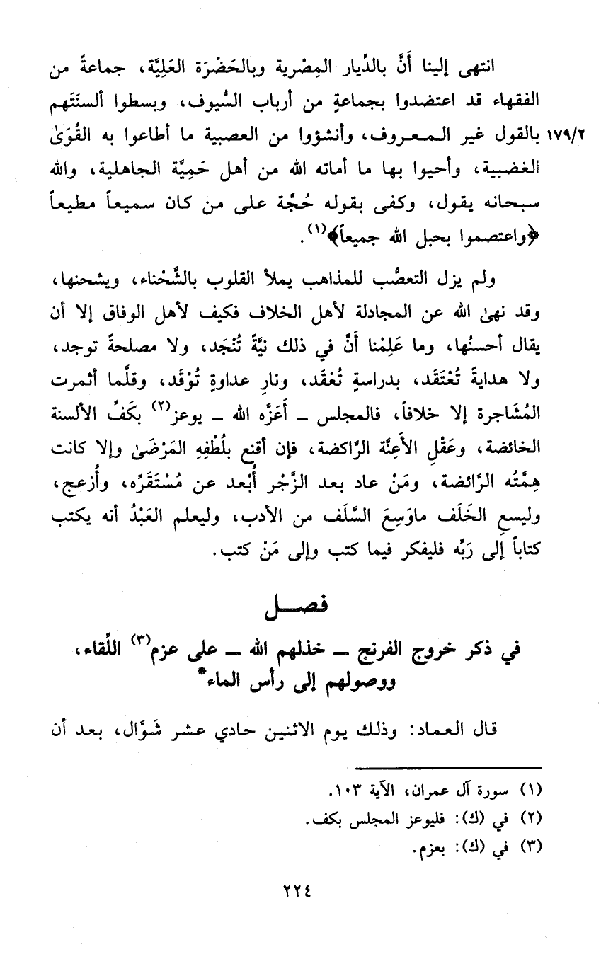 انْتهى إِلَيْنَا أَن بالديار المصرية وبالحضرة الْعلية جمَاعَة من الْفُقَهَاء قد اعتضدوا بِجَمَاعَة من أَرْبَاب السيوف وبسطوا ألسنتهم بالْقَوْل غير الْمَعْرُوف وأنشؤوا من العصبية مَا أطاعوا بِهِ القوى الغضبية وأحيوا بهَا مَا أَمَاتَهُ الله من اهل حمية الْجَاهِلِيَّة وَالله سُبْحَانَهُ يَقُول وَكفى بقوله حجَّة على من كَانَ سميعا مُطيعًا {واعتصموا بِحَبل الله جَمِيعًا}