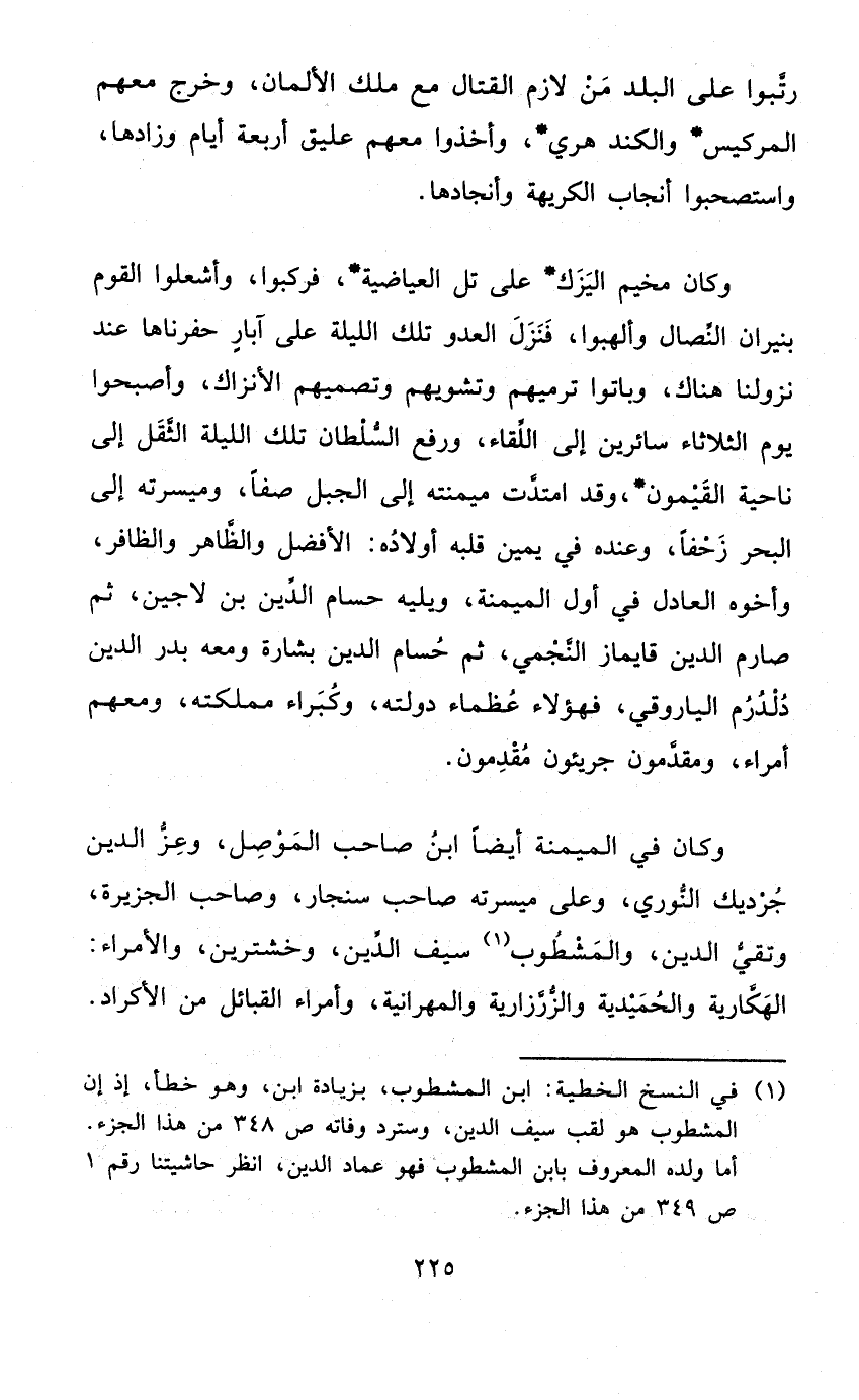 وَكَانَ فِي الميمنة أَيْضا ابْن صَاحب الْموصل وَعز الدّين جرديك النوري وعَلى ميسرته صَاحب سنجار وَصَاحب الجزيرة وتقي الدّين والمشطوب سيف الدّين وخشترين والأمراء الهكارية والحميدية والزرزارية والمهرانية وأمراء الْقَبَائِل من الأكراد