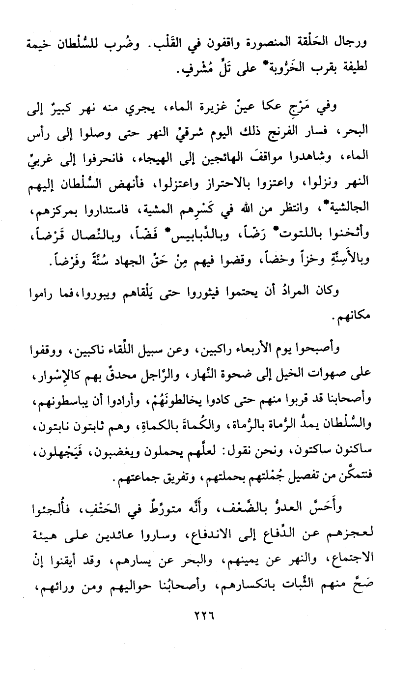 وَفِي مرج عكا عين غزيرة المَاء يجْرِي مِنْهُ نهر كَبِير إِلَى الْبَحْر فَسَار الفرنج ذَلِك الْيَوْم شَرْقي النَّهر حَتَّى وصلوا إِلَى رَأس المَاء وشاهدوا مَوَاقِف الهائجين إِلَى الهيجاء فانحرفوا إِلَى غربي النَّهر ونزلوا واعتزوا بالاحتراز واعتزلوا فأنهض السُّلْطَان إِلَيْهِم الجالشية وانتظر من الله فِي كسرهم المشية فاستداروا بمركزهم وأثخنوا باللتوت رضَا وبالدبابيس فضا وبالنصال قرضا وبالأسنة وخزا وخضا وقضوا فيهم من حق الْجِهَاد سنة وفرضا