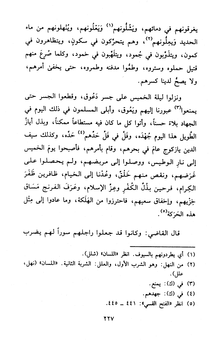 ونزلوا لَيْلَة الْخَمِيس على جسر دعوق وَقَطعُوا الجسر حَتَّى يمنعوا عبورنا إِلَيْهِم ويعوق وأبلى الْمُسلمُونَ فِي ذَلِك الْيَوْم فِي الْجِهَاد بلَاء حسنا وَأتوا كل مَا كَانَ فِيهِ مستطاعا مُمكنا وبذل أياز الطَّوِيل هَذَا الْيَوْم جهده وفل فِي فل حَدهمْ حَده وَكَذَلِكَ سيف الدّين يازكوج عَام فِي بحرهم وَقَامَ بأمرهم فَأَصْبحُوا يَوْم الْخَمِيس إِلَى نَار الْوَطِيس ووصلوا إِلَى مربضهم وَلم يحصلوا على غرضهم وَنقص مِنْهُم خلق وعدنا إِلَى الْخيام ظافرين ظفر الْكِرَام فرحين بذل الْكفْر وَعز الْإِسْلَام وَعرف الفرنج مساق خزيهم وإخفاق سَعْيهمْ فاحترزوا من الهلكة وَمَا عَادوا إِلَى مثل هَذِه الْحَرَكَة