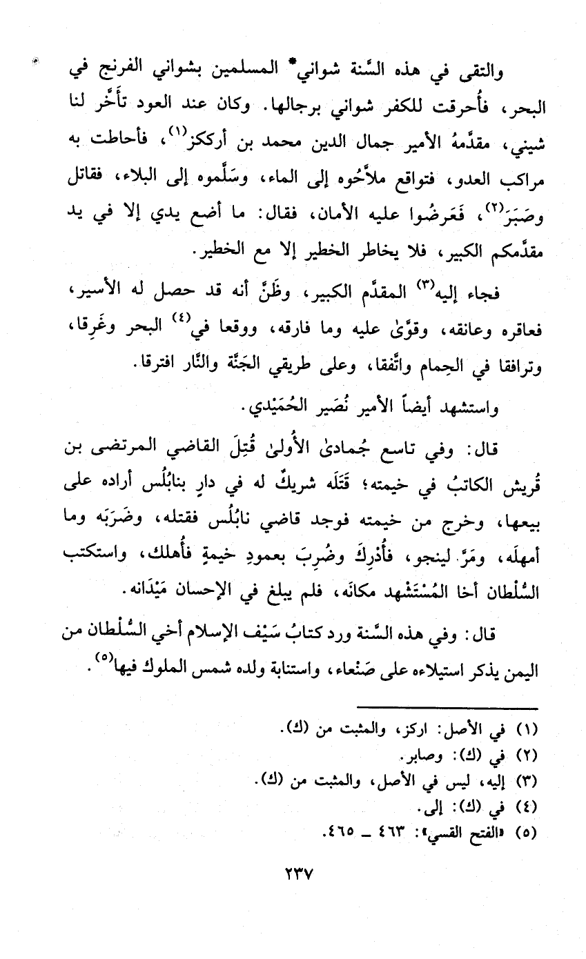 والتقى فِي هَذِه السّنة شواني الْمُسلمين بشواني الفرنج فِي الْبَحْر فأحرقت للكفر شواني برجالها وَكَانَ عِنْد الْعود تَأَخّر لنا شيني مقدمه الْأَمِير جمال الدّين مُحَمَّد بن أرككز فأحاطت بِهِ مراكب الْعَدو فتواقع ملاحوه إِلَى المَاء وسلموه إِلَى الْبلَاء فقاتل وصبر فعرضوا عَلَيْهِ الْأمان فَقَالَ مَا أَضَع يَدي إِلَّا فِي يَد مقدمكم الْكَبِير فَلَا يخاطر الخطير إِلَّا مَعَ الخطير