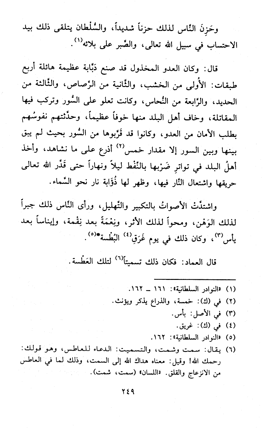 قَالَ وَكَانَ الْعَدو المخذول قد صنع دبابة عَظِيمَة هائلة أَربع طَبَقَات الأولى من الْخشب وَالثَّانيَِة من الرصاص وَالثَّالِثَة من الْحَدِيد وَالرَّابِعَة من النّحاس وَكَانَت تعلو على السُّور وتركب فِيهَا الْمُقَاتلَة وَخَافَ أهل الْبَلَد مِنْهَا خوفًا عَظِيما وحدثتهم نُفُوسهم بِطَلَب الْأمان من الْعَدو وَكَانُوا قد قربوها من السُّور بِحَيْثُ لم يبْق بَينهَا وَبَين السُّور إِلَّا مِقْدَار خمس أَذْرع على مَا نشاهد وَأخذ أهل الْبَلَد فِي تَوَاتر ضربهَا بالنفط لَيْلًا وَنَهَارًا حَتَّى قدر الله تَعَالَى حريقها واشتعال النَّار فِيهَا وَظهر لَهَا ذؤابة نَار نَحْو السَّمَاء