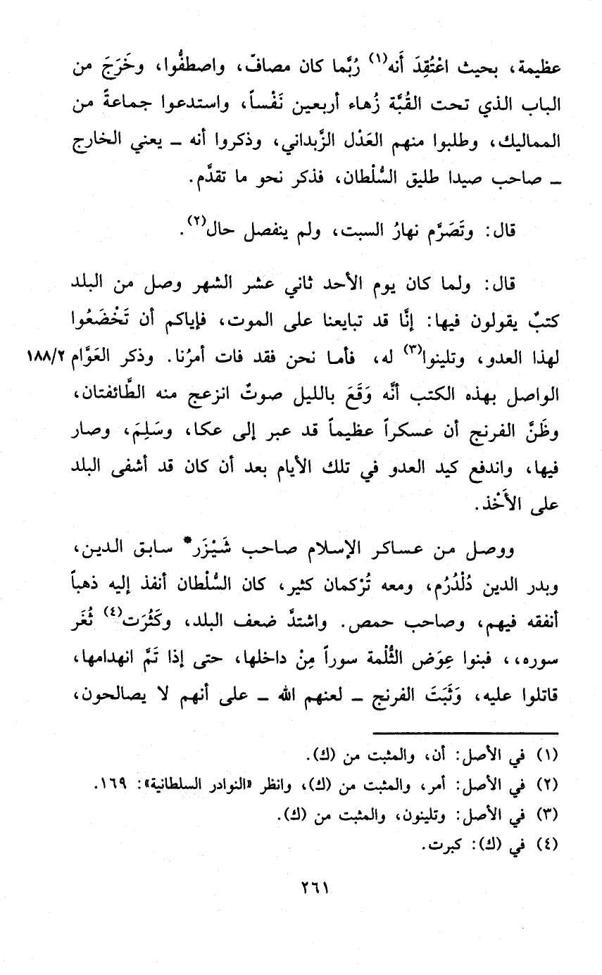 وَوصل من عَسَاكِر الْإِسْلَام صَاحب شيزر سَابق الدّين وَبدر الدّين دلدرم وَمَعَهُ تركمان كثير كَانَ السُّلْطَان أنفذ إِلَيْهِ ذَهَبا أنفقهُ فيهم وَصَاحب حمص وَاشْتَدَّ ضعف الْبَلَد وَكَثُرت ثغر سوره فبنوا عوض الثلمة سورا من داخلها حَتَّى إِذا تمّ انهدامها قَاتلُوا عَلَيْهِ وَثَبت الفرنج - لعنهم الله - على أَنهم لَا يصالحون