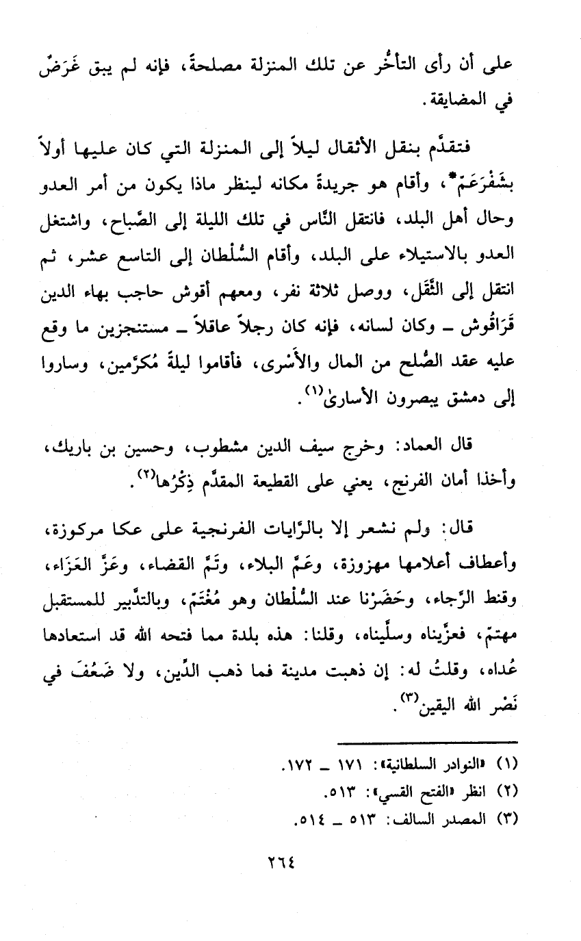 قَالَ وَلم نشعر إِلَّا بالرايات الفرنجية على عكا مركوزة واعطاف أعلامها مهزوزة وَعم الْبلَاء وَتمّ الْقَضَاء وَعز العزاء وَقَنطَ الرَّجَاء وحضرنا عِنْد السُّلْطَان وَهُوَ مُغْتَم وبالتدبير للمستقبل مهتم فعزيناه وسليناه وَقُلْنَا هَذِه بَلْدَة مِمَّا فَتحه الله قد استعادها عداهُ وَقلت لَهُ إِن ذهبت مَدِينَة فَمَا ذهب الدّين وَلَا ضعف فِي نصر الله الْيَقِين