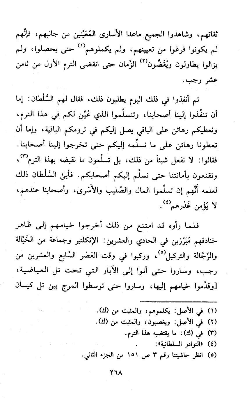 ثمَّ أنفذوا فِي ذَلِك الْيَوْم يطْلبُونَ ذَلِك فَقَالَ لَهُم السُّلْطَان إِمَّا أَن تنفذوا إِلَيْنَا أَصْحَابنَا وتتسلموا الَّذِي عين لكم فِي هَذَا الترم ونعطيكم رهائن على الْبَاقِي يصل إِلَيْكُم فِي ترومكم الْبَاقِيَة وَإِمَّا أَن تعطونا رهائن على مَا نسلمه إِلَيْكُم حَتَّى تخْرجُوا إِلَيْنَا أَصْحَابنَا فَقَالُوا لَا نَفْعل شَيْئا من ذَلِك بل تسلمون مَا نقبضه بِهَذَا الترم وتقنعون بأمانتنا حَتَّى نسلم إِلَيْكُم أصحابكم فَأبى السُّلْطَان ذَلِك لعلمه أَنهم إِن تسلموا المَال والصليب والأسرى وأصحابنا عِنْدهم لَا يُؤمن غدرهم
