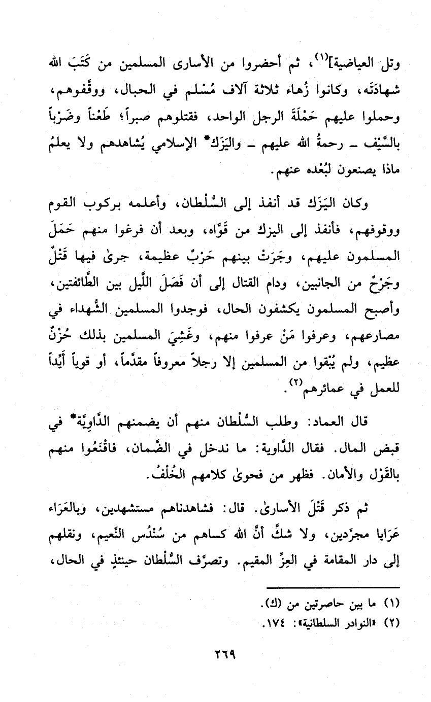 وتل العياضية ثمَّ أحضروا من الْأُسَارَى الْمُسلمين من كتب الله شَهَادَته وَكَانُوا زهاء ثَلَاثَة آلَاف مُسلم فِي الحبال ووقفوهم وحملوا عَلَيْهِم حَملَة الرجل الْوَاحِد فَقَتَلُوهُمْ صبرا طَعنا وَضَربا بِالسَّيْفِ - رَحْمَة الله عَلَيْهِم - واليزك الإسلامي يشاهدهم وَلَا يعلم مَاذَا يصنعون لبعده عَنْهُم