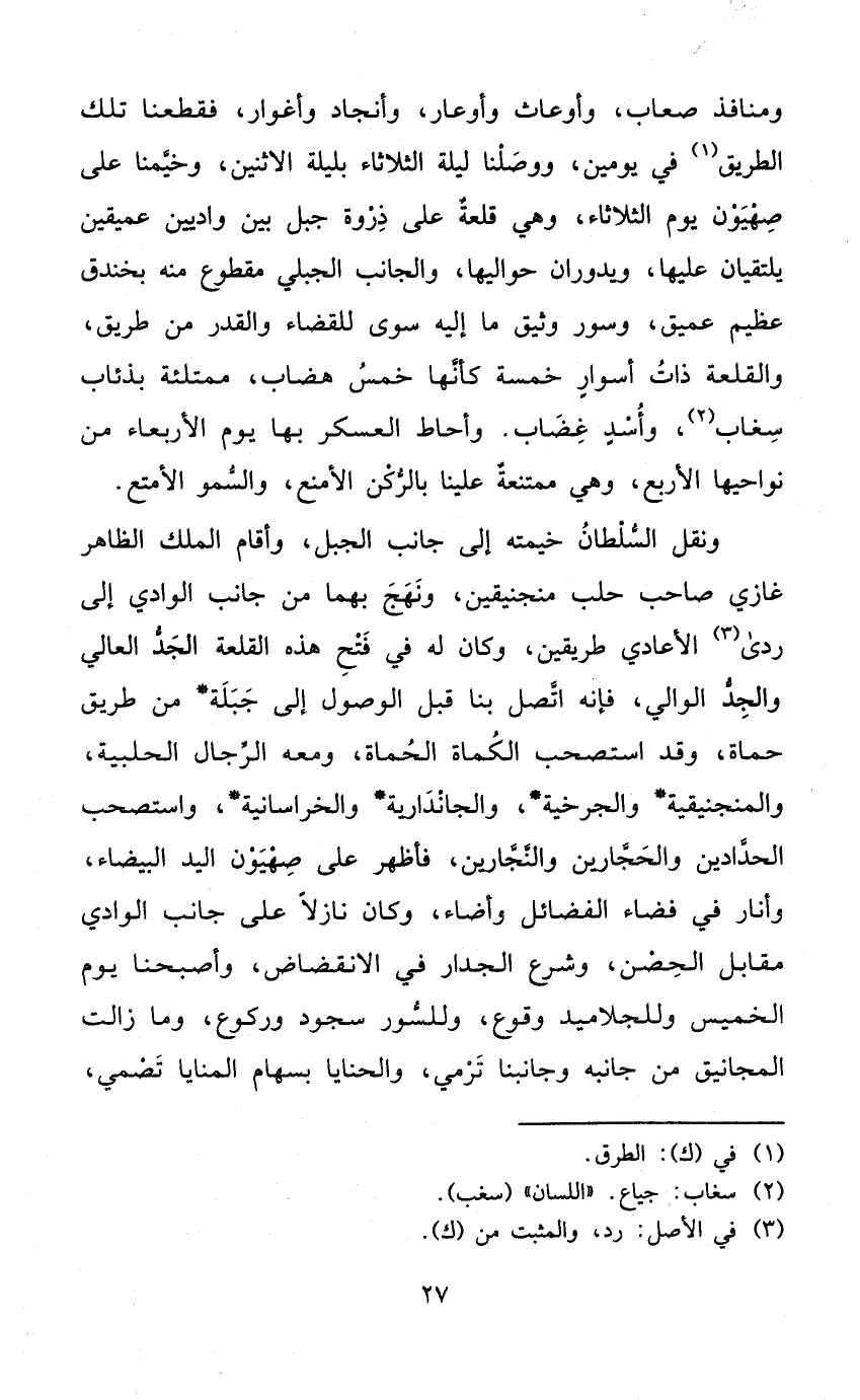 ومنافذ صعاب وأوعاث وأوعار وأنجاد وأغوار فقطعنا تِلْكَ الطَّرِيق فِي يَوْمَيْنِ ووصلنا لَيْلَة الثُّلَاثَاء بليلة الأثنين وخيمنا على صهيون يَوْم الثُّلَاثَاء وَهِي قلعة على ذرْوَة جبل بَين واديين عميقيين يَلْتَقِيَانِ عَلَيْهَا ويدوران حواليها والجانب الْجبلي مَقْطُوع مِنْهُ بخندق عَظِيم عميق وسور وثيق مَا إِلَيْهِ سوى للْقَضَاء وَالْقدر من طَرِيق والقلعة ذَات أسوار خَمْسَة كَأَنَّهَا خمس هضاب ممتلئة بذئاب سغاب وَأسد غضاب وأحاط الْعَسْكَر بهَا يَوْم الْأَرْبَعَاء من نَوَاحِيهَا الْأَرْبَع وَهِي ممتنعة علينا بالركن الأمنع والسمو الأمتع