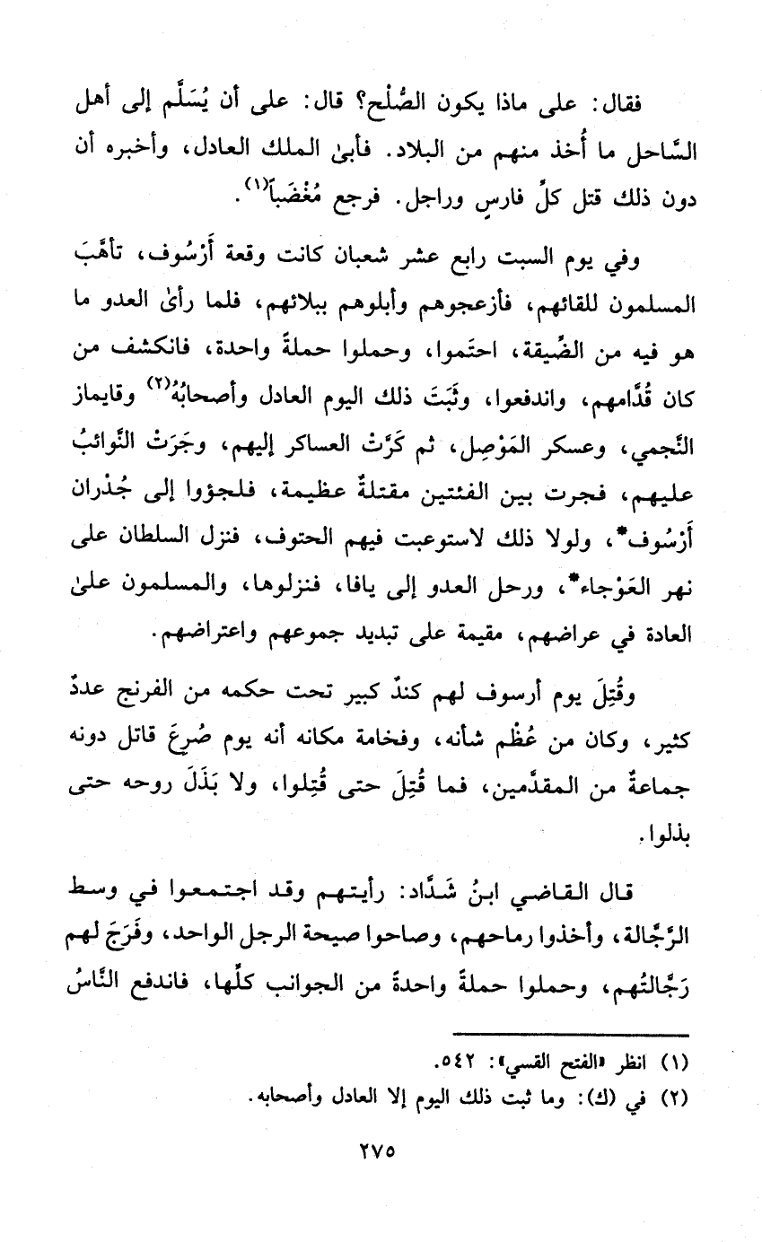 وَفِي يَوْم السبت رَابِع عشر شعْبَان كَانَت وقْعَة أرسوف تأهب الْمُسلمُونَ للقائهم فأزعجوهم وأبلوهم ببلائهم فَلَمَّا رأى الْعَدو مَا هُوَ فِيهِ من الضيقة احتموا وحملوا حَملَة وَاحِدَة فانكشف من كَانَ قدامهم واندفعوا وَثَبت ذَلِك الْيَوْم الْعَادِل وَأَصْحَابه وقايماز النجمي وعسكر الْموصل ثمَّ كرت العساكر إِلَيْهِم وَجَرت النوائب عَلَيْهِم فجرت بَين الفئتين مقتلة عَظِيمَة فلجؤوا إِلَى جدران أرسوف وَلَوْلَا ذَلِك لاستوعبت فيهم الحتوف فَنزل السُّلْطَان على نهر العوجاء ورحل الْعَدو إِلَى يافا فنزلوها والمسلمون على الْعَادة فِي عراضهم مُقِيمَة على تبديد جموعهم واعتراضهم
