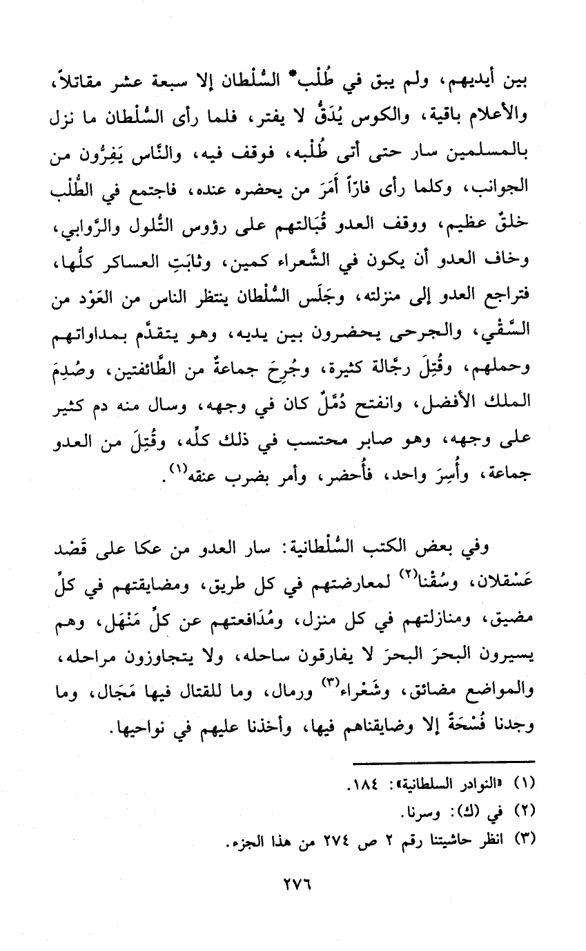 بَين أَيْديهم وَلم يبْق فِي طلب السُّلْطَان إِلَّا سَبْعَة عشر مُقَاتِلًا والأعلام بَاقِيَة والكوس يدق لَا يفتر فَلَمَّا رأى السُّلْطَان مَا نزل بِالْمُسْلِمين سَار حَتَّى أَتَى طلبه فَوقف فِيهِ وَالنَّاس يفرون من الجوانب وَكلما رأى فَارًّا أَمر من يحضرهُ عِنْده فَاجْتمع فِي الطّلب خلق عَظِيم ووقف الْعَدو قبالتهم على رُؤُوس التلول والروابي وَخَافَ الْعَدو أَن يكون فِي الشُّعَرَاء كمين وثابت العساكر كلهَا فتراجع الْعَدو إِلَى مَنْزِلَته وَجلسَ السُّلْطَان ينْتَظر النَّاس من الْعود من السَّقْي والجرحى يحْضرُون بَين يَدَيْهِ وَهُوَ يتَقَدَّم بمداواتهم وَحَملهمْ وَقتل رجالة كَثِيرَة وجرح جمَاعَة من الطَّائِفَتَيْنِ وصدم الْملك الْأَفْضَل وَانْفَتح دمل كَانَ فِي وَجهه وسال مِنْهُ دم كثير على وَجهه وَهُوَ صابر محتسب فِي ذَلِك كُله وَقتل من الْعَدو جمَاعَة وَأسر وَاحِد فأحضر وَأمر بِضَرْب عُنُقه