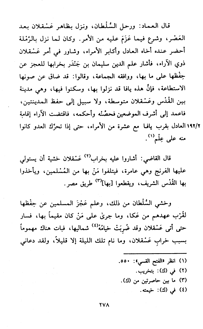 قَالَ الْعِمَاد ورحل السُّلْطَان وَنزل بِظَاهِر عسقلان بعد الْعَصْر وَشرع فِيمَا عزم عَلَيْهِ من الْأَمر وَكَانَ لما نزل بالرملة أحضر عِنْده أَخَاهُ الْعَادِل وأكابر الْأُمَرَاء وشاور فِي أَمر عسقلان ذَوي الآراء فَأَشَارَ علم الدّين سُلَيْمَان بن جندر بخرابها للعجز عَن حفظهَا على مَا بهَا وَوَافَقَهُ الْجَمَاعَة وَقَالُوا قد ضَاقَ عَن صونها الِاسْتِطَاعَة فَإِن هَذِه يافا قد نزلُوا بهَا وَسَكنُوا فِيهَا وَهِي مَدِينَة بَين الْقُدس وعسقلان متوسطة وَلَا سَبِيل إِلَى حفظ المدينتين فاعمد إِلَى أشرف الْمَوْضِعَيْنِ فحصنه وأحكمه فاقتضت الآراء إِقَامَة الْعَادِل بِقرب يافا مَعَ عشرَة من الْأُمَرَاء حَتَّى إِذا تحرّك الْعَدو كَانُوا مِنْهُ على علم