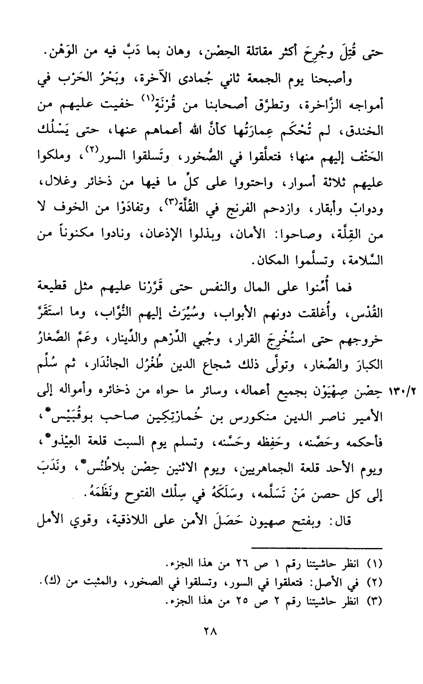 فَمَا أمنُوا على المَال وَالنَّفس حَتَّى قَررنَا عَلَيْهِم مثل قطيعة الْقُدس وأغلقت دونهم الْأَبْوَاب وسيرت إِلَيْهِم النواب وَمَا اسْتَقر خُرُوجهمْ حَتَّى استخرج الْقَرار وجبي الدِّرْهَم وَالدِّينَار وَعم الصغار الْكِبَار وَالصغَار وَتَوَلَّى ذَلِك شُجَاع الدّين طغرل الجاندار ثمَّ سلم حصن صهيون بِجَمِيعِ أَعماله وَسَائِر مَا حواه من ذخائره وأمواله إِلَى الْأَمِير نَاصِر الدّين منكورس بن خمارتكين صَاحب بوقبيس فأحكمه وحصنه وَحفظه وَحسنه وتسلم يَوْم السبت قلعة العيذو وَيَوْم الْأَحَد قلعة الجماهريين وَيَوْم الِاثْنَيْنِ حصن بلاطنس وَندب إِلَى كل حُصَيْن من تسلمه وسلكه فِي سلك الْفتُوح ونظمه