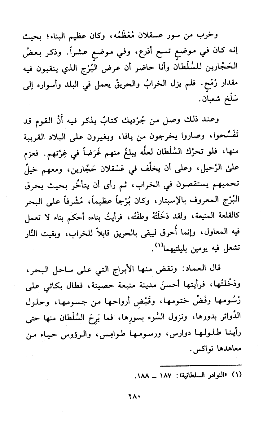 وَخرب من سور عسقلان معظمه وَكَانَ عَظِيم الْبناء بِحَيْثُ إِنَّه كَانَ فِي مَوضِع تسع أَذْرع وَفِي مَوضِع عشرا وَذكر بعض الحجارين للسُّلْطَان وَأَنا حَاضر أَن عرض البرج الَّذِي ينقبون فِيهِ مِقْدَار رمح فَلم يزل الخراب والحريق يعْمل فِي الْبَلَد وأسواره إِلَى سلخ شعْبَان