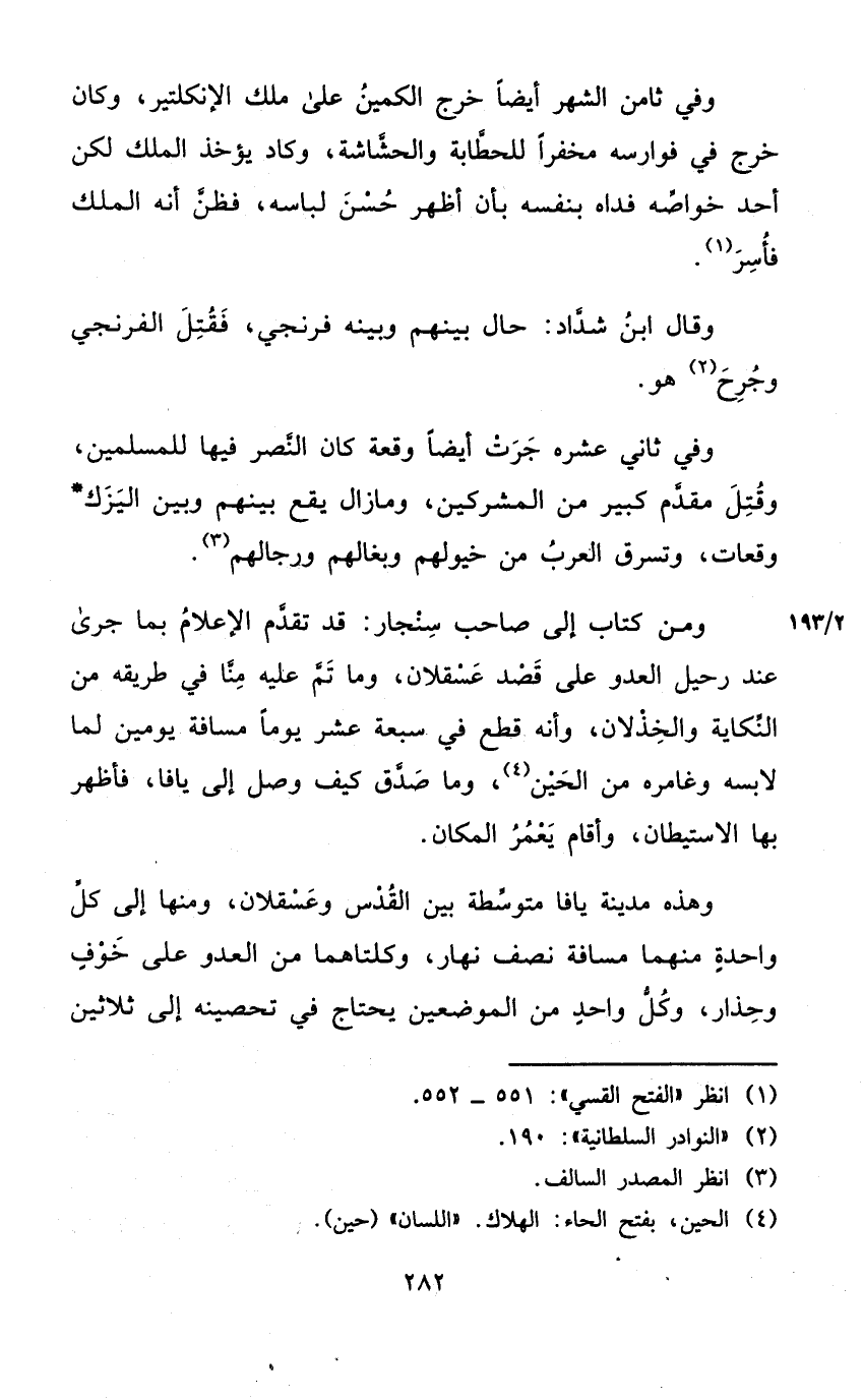 وَمن كتاب إِلَى صَاحب سنجار قد تقدم الاعلام بِمَا جرى عِنْد رحيل الْعَدو على قصد عسقلان وَمَا تمّ عَلَيْهِ منا فِي طَرِيقه من النكاية والخذلان وَأَنه قطع فِي سَبْعَة عشر يَوْمًا مَسَافَة يَوْمَيْنِ لما لابسه وغامره من الْحِين وَمَا صدق كَيفَ وصل إِلَى يافا فأظهر بهَا الاستيطان وَأقَام يعمر الْمَكَان