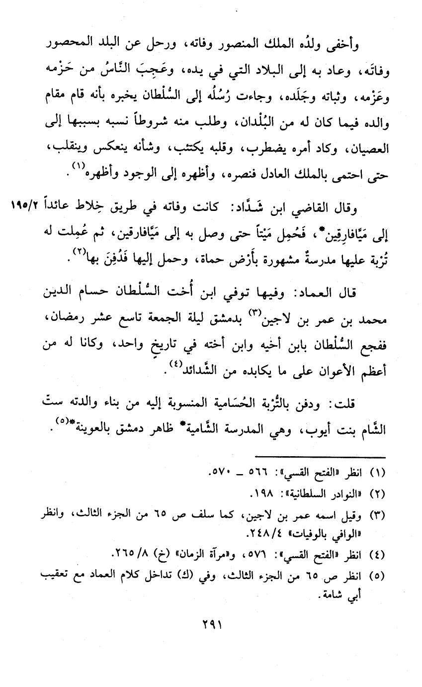 قَالَ الْعِمَاد وفيهَا توفّي ابْن أُخْت السُّلْطَان حسام الدّين مُحَمَّد بن عمر بن لاجين بِدِمَشْق لَيْلَة الْجُمُعَة تَاسِع عشر رَمَضَان ففجع السُّلْطَان بِابْن أَخِيه وَابْن أُخْته فِي تَارِيخ وَاحِد وَكَانَا لَهُ من أعظم الأعوان على مَا يكابده من الشدائد