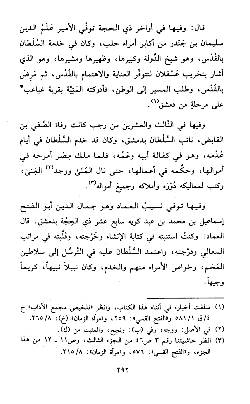 قَالَ وفيهَا فِي أَوَاخِر ذِي الْحجَّة توفّي الْأَمِير علم الدّين سُلَيْمَان بن جندر من أكَابِر أُمَرَاء حلب وَكَانَ فِي خدمَة السُّلْطَان بالقدس وَهُوَ شيخ الدولة وكبيرها وظهيرها ومشيرها وَهُوَ الَّذِي أَشَارَ بتخريب عسقلان لتتوفر الْعِنَايَة والاهتمام بالقدس ثمَّ مرض بالقدس وَطلب الْمسير إِلَى الوطن فَأَدْرَكته الْمنية بقرية غباغب على مرحلة من دمشق