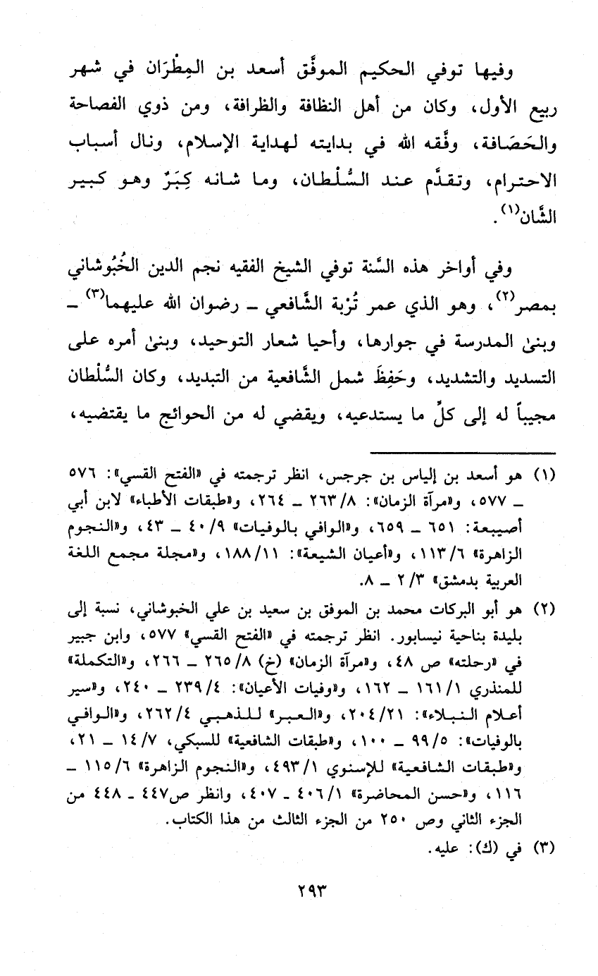 وَفِي أَوَاخِر هَذِه السّنة توفّي الشَّيْخ الْفَقِيه نجم الدّين الخبوشاني بِمصْر وَهُوَ الَّذِي عمر تربة الشَّافِعِي - رضوَان الله عَلَيْهِمَا - وَبنى الْمدرسَة فِي جوارها وَأَحْيَا شعار التَّوْحِيد وَبنى أمره على التسديد وَالتَّشْدِيد وَحفظ شَمل الشَّافِعِيَّة من التبديد وَكَانَ السُّلْطَان مجيبا لَهُ إِلَى كل مَا يستدعيه وَيَقْضِي لَهُ من الْحَوَائِج مَا يَقْتَضِيهِ
