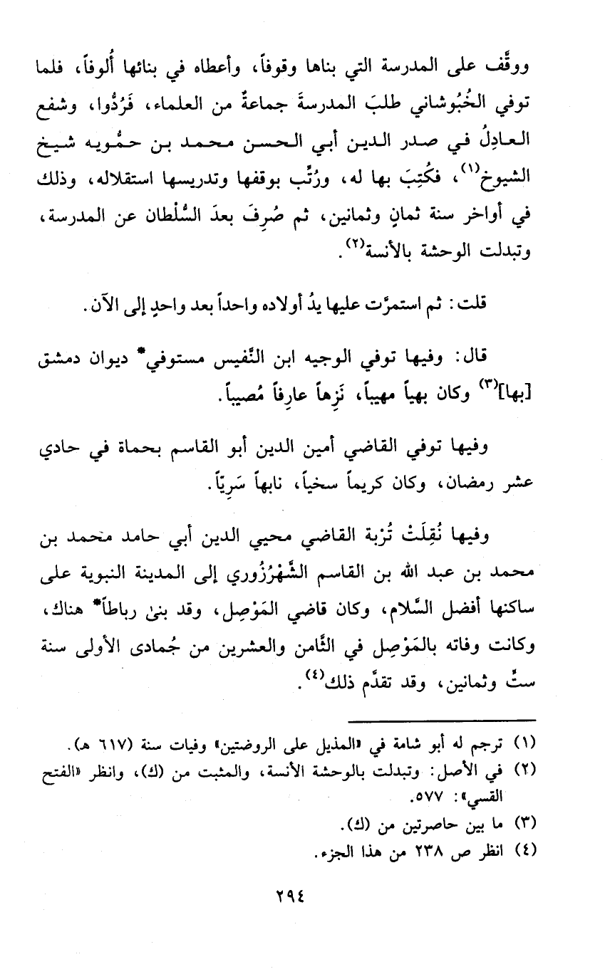 ووقف على الْمدرسَة الَّتِي بناها وقوفا وَأَعْطَاهُ فِي بنائها ألوفا فَلَمَّا توفّي الخبوشاني طلب الْمدرسَة جمَاعَة من الْعلمَاء فَردُّوا وشفع الْعَادِل فِي صدر الدّين أبي الْحسن مُحَمَّد بن حمويه شيخ الشُّيُوخ فَكتب بهَا لَهُ ورتب بوقفها وتدريسها استقلاله وَذَلِكَ فِي أَوَاخِر سنة ثَمَان وَثَمَانِينَ ثمَّ صرف بعد السُّلْطَان عَن الْمدرسَة وتبدلت الوحشة بالأنسة