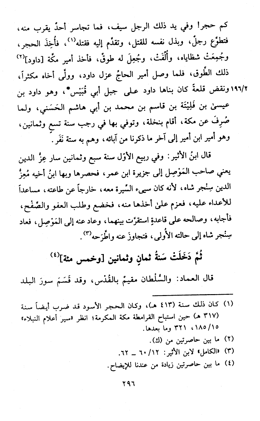 كم حجر وَفِي يَد ذَلِك الرجل سيف فَمَا تجاسر أحد يقرب مِنْهُ فتطوع رجل وبذل نَفسه للْقَتْل وَتقدم إِلَيْهِ فَقتله فَأخذ الْحجر وجمعت شظاياه وألفت وَجعل لَهُ طوق فَأخذ أميرمكة دَاوُد ذَلِك الطوق فَلَمَّا وصل أَمِير الْحَاج عزل دَاوُد وَولى أَخَاهُ مكثرا وَنقض قلعة كَانَ بناها دَاوُد على جبل أبي قبيس وَهُوَ دَاوُد بن عِيسَى بن فليتة بن قَاسم بن مُحَمَّد بن أبي هَاشم الحسني وَلما صرف عَن مَكَّة أَقَامَ بنخلة وَتُوفِّي بهَا فِي رَجَب سنة تسع وَثَمَانِينَ وَهُوَ أَمِير ابْن أَمِير إِلَى آخر مَا ذكرنَا من آبَائِهِ وهم بِهِ سِتَّة نفر