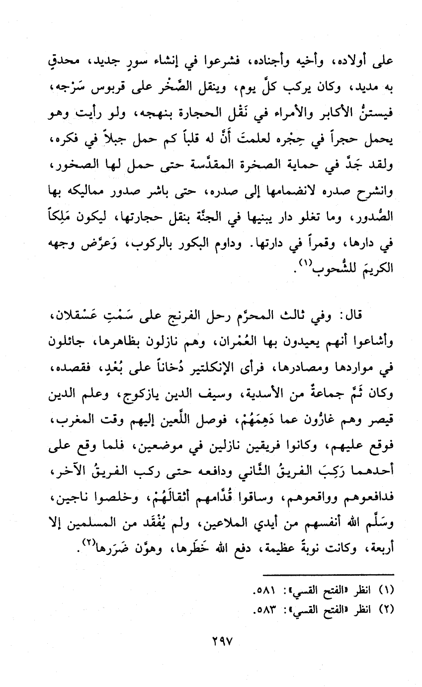 على أَوْلَاده وأخيه وأجناده فشرعوا فِي إنْشَاء سور جَدِيد محدق بِهِ مديد وَكَانَ يركب كل يَوْم وينقل الصخر على قربوس سَرْجه فيستن الأكابر والأمراء فِي نقل الْحِجَارَة بنهجه وَلَو رَأَيْت وَهُوَ يحمل حجرا فِي حجره لعَلِمت أَن لَهُ قلبا كم حمل جبلا فِي فكره وَلَقَد جد فِي حماية الصَّخْرَة المقدسة حَتَّى حمل لَهَا الصخور وانشرح صَدره لانضمامها إِلَى صَدره حَتَّى بَاشر صُدُور مماليكه بهَا الصُّدُور وَمَا تغلو دَار يبنيها فِي الْجنَّة بِنَقْل حجارتها ليَكُون ملكا فِي دارها وقمرا فِي دارتها وداوم البكور بالركوب وَعرض وَجهه الْكَرِيم للشحوب
