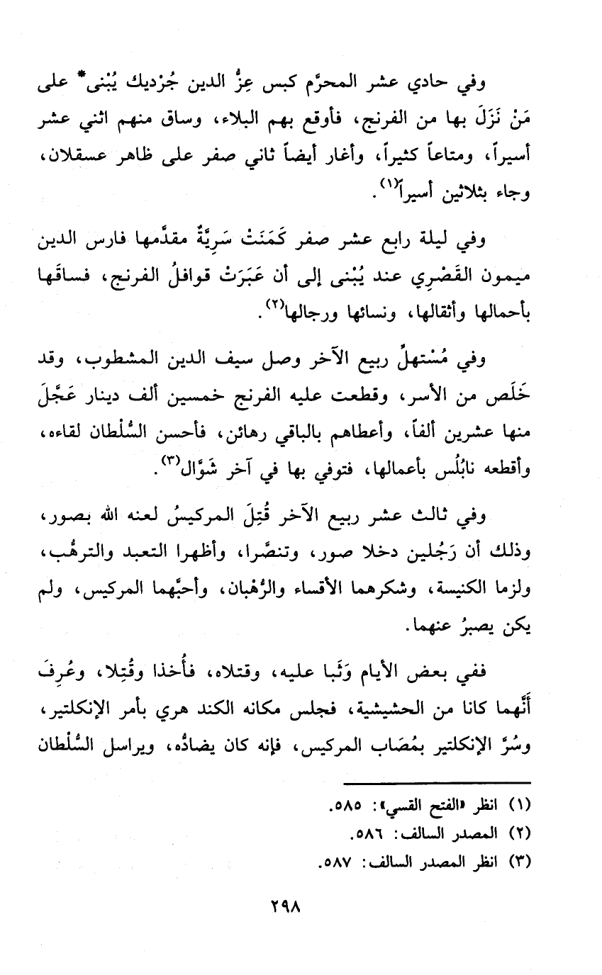 وَفِي ثَالِث عشر ربيع الآخر قتل المركيس لَعنه الله بصور وَذَلِكَ أَن رجلَيْنِ دخلا صور وتنصرا وأظهرا التَّعَبُّد وَالتَّرَهُّب ولزما الْكَنِيسَة وشكرهما الأقساء والرهبان وأحبهما المركيس وَلم يكن يصبر عَنْهُمَا