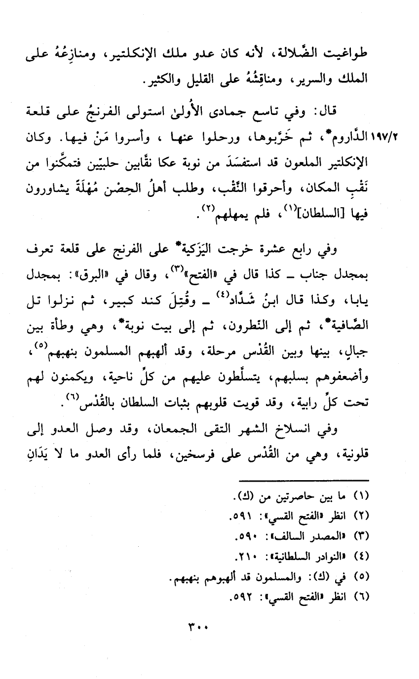 قَالَ وَفِي تَاسِع جُمَادَى الأولى استولى الفرنج على قلعة الداروم ثمَّ خربوها ورحلوا عَنْهَا وأسروا من فِيهَا وَكَانَ الإنكلتير الملعون قد استفسد من نوبَة عكا نقابين حلبيين فتمكنوا من نقب الْمَكَان وأحرقوا النقب وَطلب أهل الْحصن مهلة يشاورون فِيهَا السُّلْطَان فَلم يمهلهم