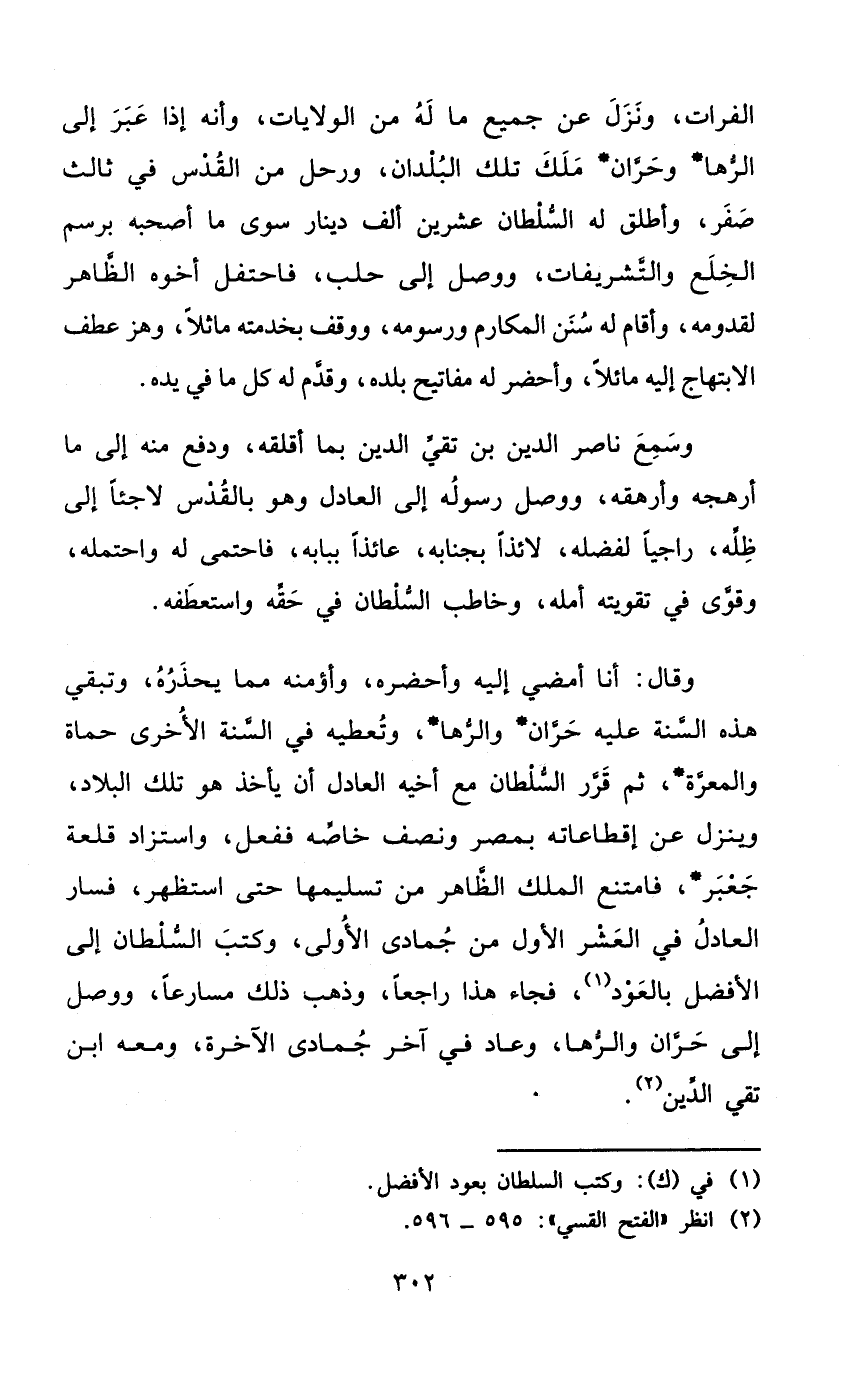 وَقَالَ أَنا أمضي إِلَيْهِ وأحضره وأؤمنه مِمَّا يحذرهُ وتبقي هَذِه السّنة عَلَيْهِ حران والرها وتعطيه فِي السّنة الْأُخْرَى حماة والمعرة ثمَّ قرر السُّلْطَان مَعَ أَخِيه الْعَادِل أَن يَأْخُذ هُوَ تِلْكَ الْبِلَاد وَينزل عَن إقطاعاته بِمصْر وَنصف خاصه فَفعل واستزاد قلعة جعبر فَامْتنعَ الْملك الظَّاهِر من تَسْلِيمهَا حَتَّى استظهر فَسَار الْعَادِل فِي الْعشْر الأول من جُمَادَى الأولى وَكتب السُّلْطَان إِلَى الْأَفْضَل بِالْعودِ فجَاء هَذَا رَاجعا وَذهب ذَلِك مسارعا وَوصل إِلَى حران والرها وَعَاد فِي آخر جُمَادَى الْآخِرَة وَمَعَهُ ابْن تَقِيّ الدّين