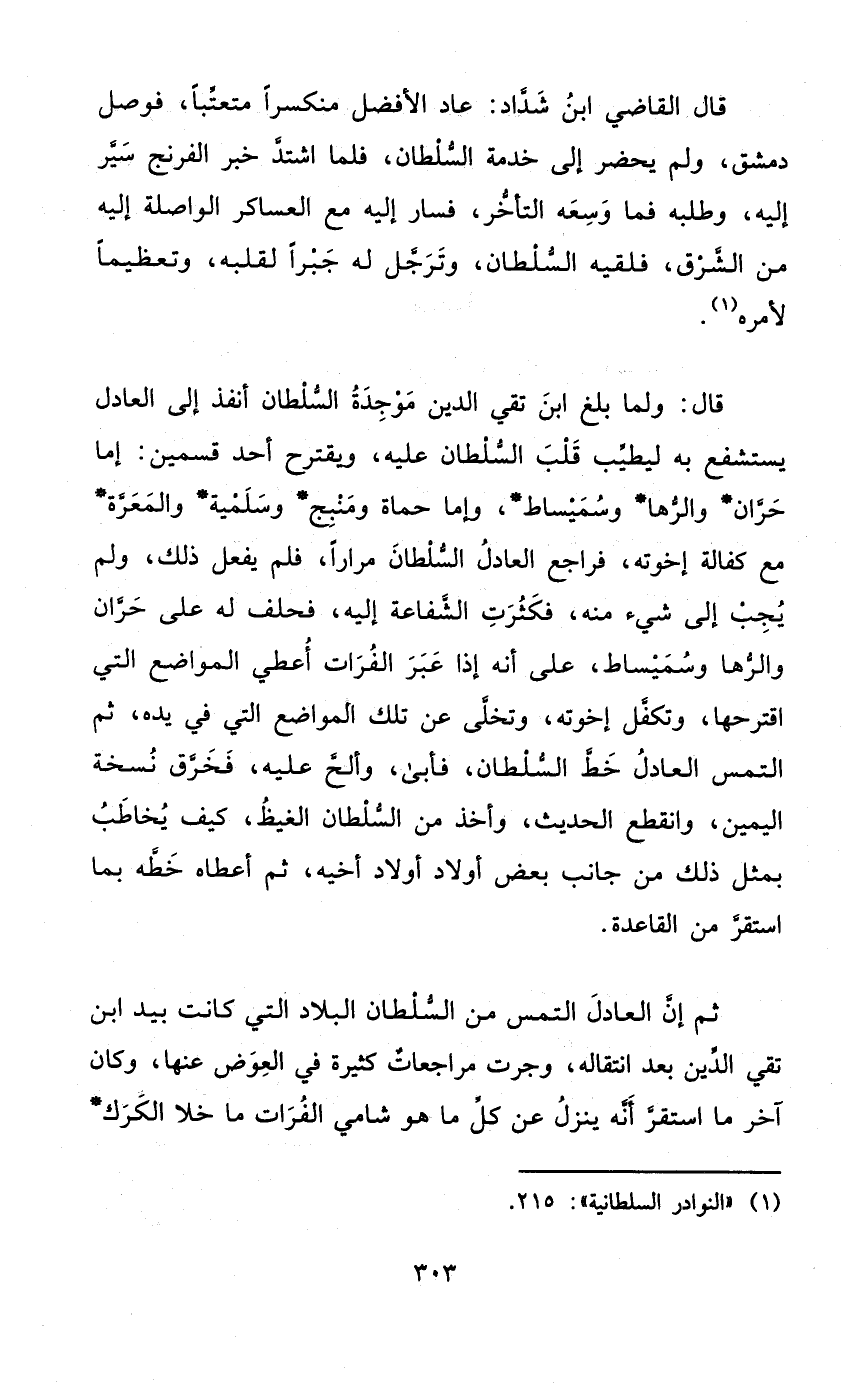 قَالَ وَلما بلغ ابْن تَقِيّ الدّين موجدة السُّلْطَان أنفذ إِلَى الْعَادِل يستشفع بِهِ ليطيب قلب السُّلْطَان عَلَيْهِ ويقترح أحد قسمَيْنِ إِمَّا حران والرها وسميساط وَإِمَّا حماة ومنبج وسلمية والمعرة مَعَ كَفَالَة إخْوَته فراجع الْعَادِل السُّلْطَان مرَارًا فَلم يفعل ذَلِك وَلم يجب إِلَى شَيْء مِنْهُ فكثرت الشَّفَاعَة إِلَيْهِ فَحلف لَهُ على حران والرها وسميساط على أَنه إِذا عبر الْفُرَات أعطي الْمَوَاضِع الَّتِي اقترحها وتكفل إخْوَته وتخلى عَن تِلْكَ الْمَوَاضِع الَّتِي فِي يَده ثمَّ التمس الْعَادِل خطّ السُّلْطَان فَأبى وألح عَلَيْهِ فخرق نُسْخَة الْيَمين وَانْقطع الحَدِيث وَأخذ من السُّلْطَان الغيظ كَيفَ يُخَاطب بِمثل ذَلِك من جَانب بعض أَوْلَاد أَوْلَاد أَخِيه ثمَّ أعطَاهُ خطه بِمَا اسْتَقر من الْقَاعِدَة
